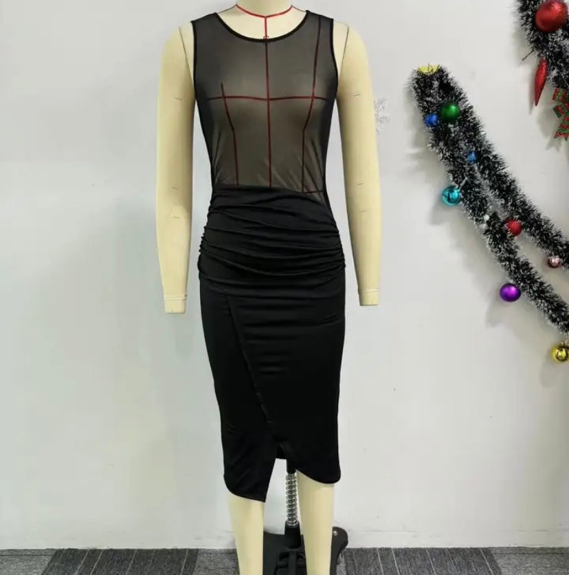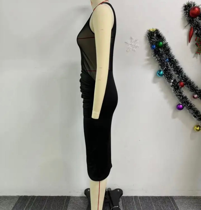 Women Sexy Black Money Print Long Sleeve Mesh Fashion Dress