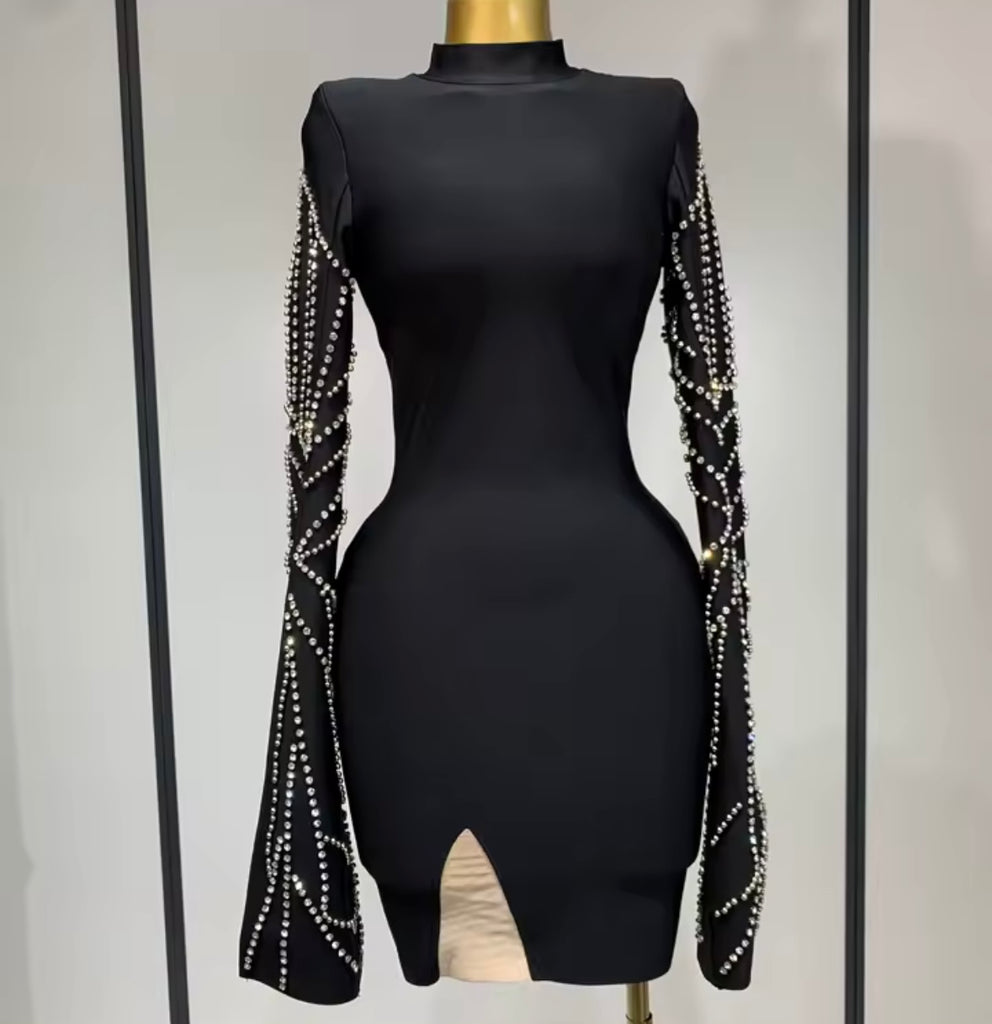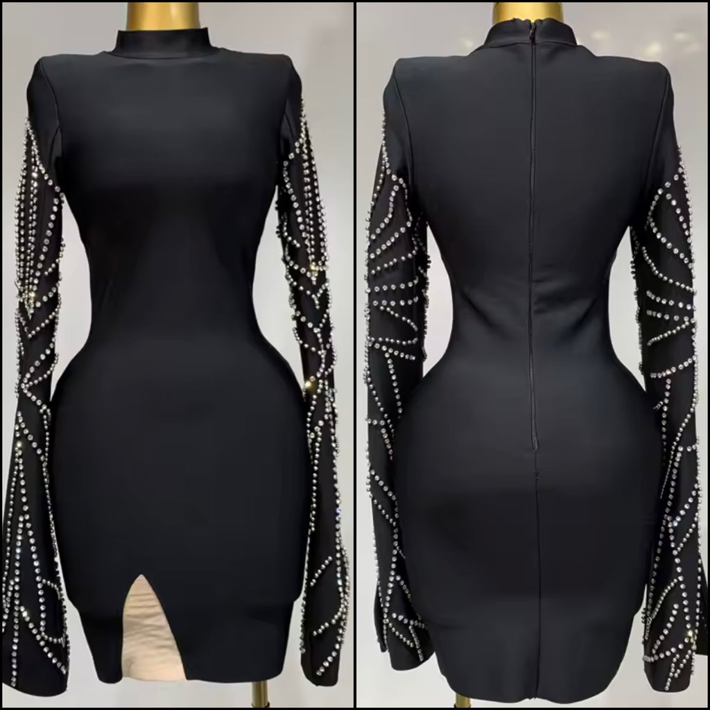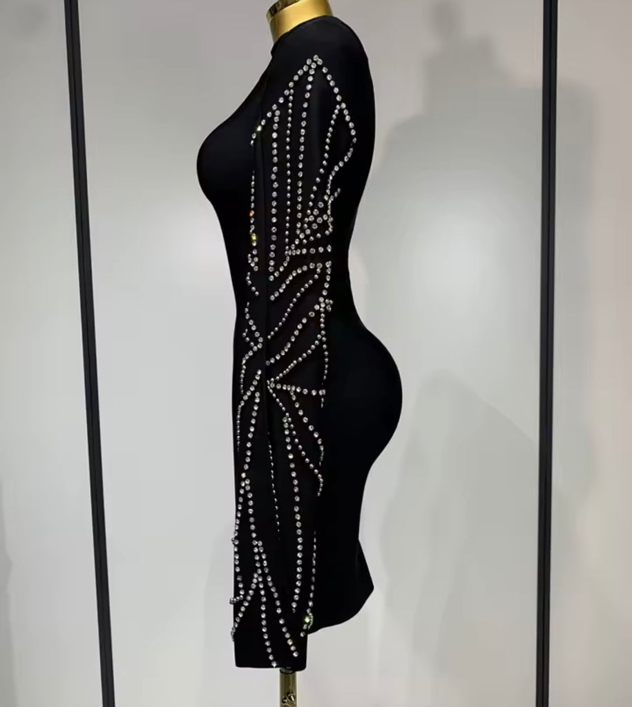 Women Sexy Sequins Rhinestone Cut Out Full Sleeve Dress