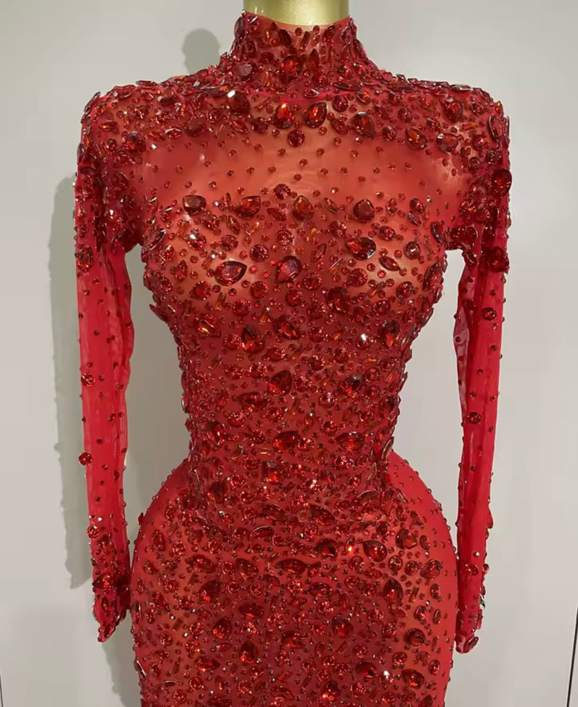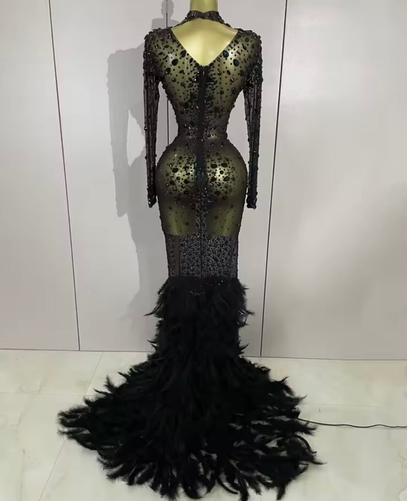 Women Sexy Color Crystal Feather Full Sleeve Mesh Maxi Dress
