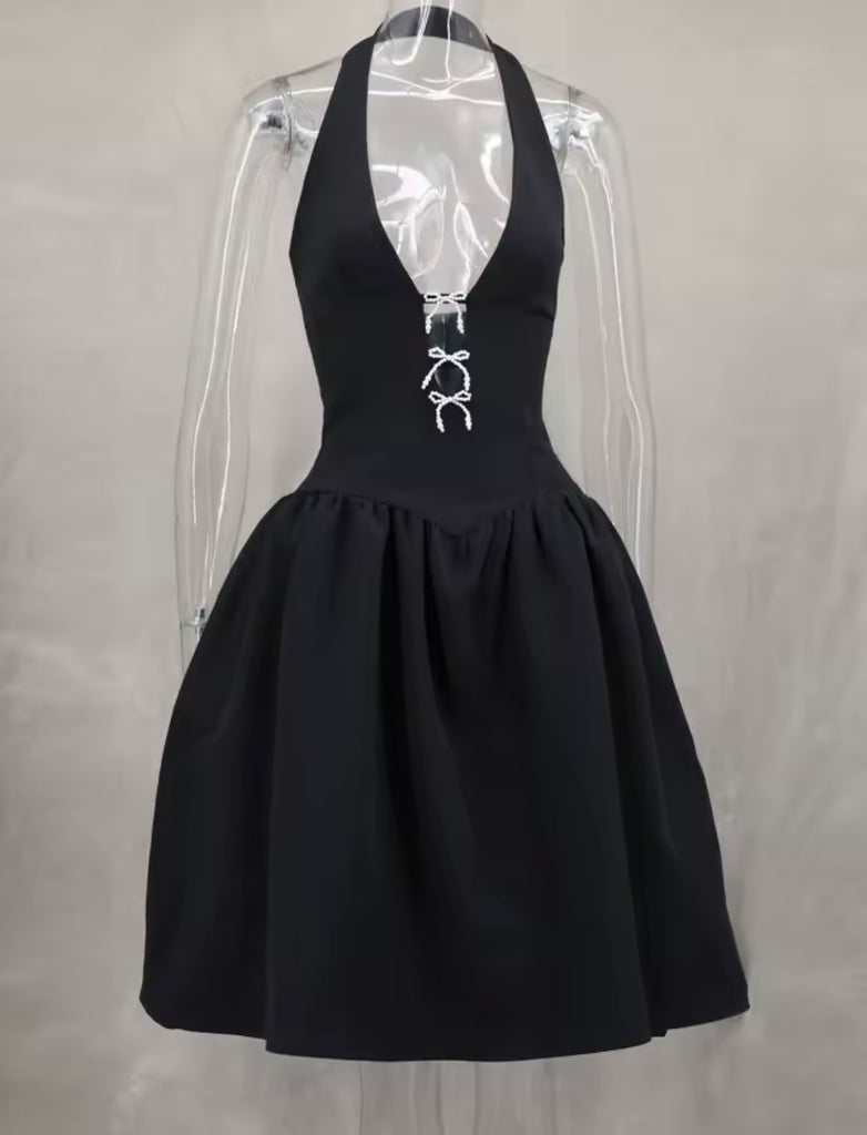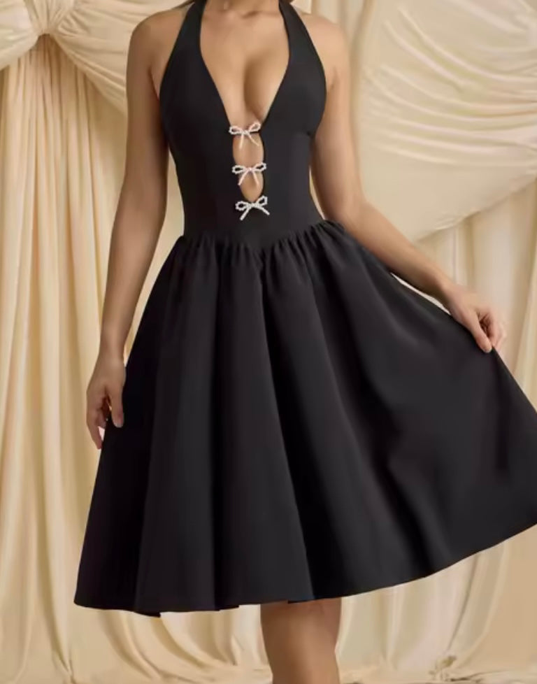 Women Sexy Pearl Bow Cut Out Halter Sleeveless Dress