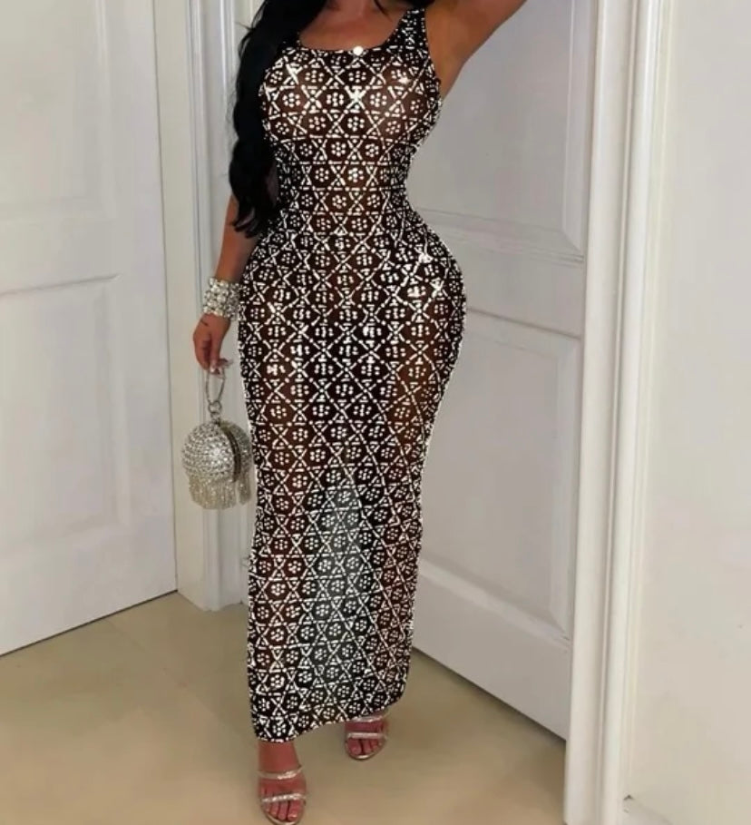 Women Sexy Sleeveless Bling Mesh Maxi Dress