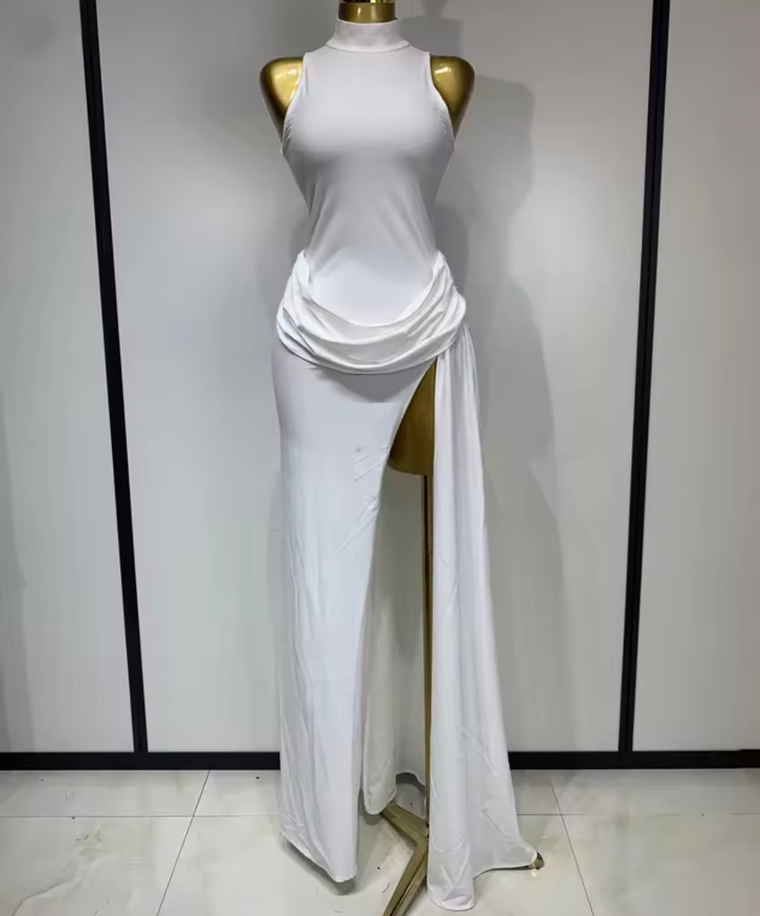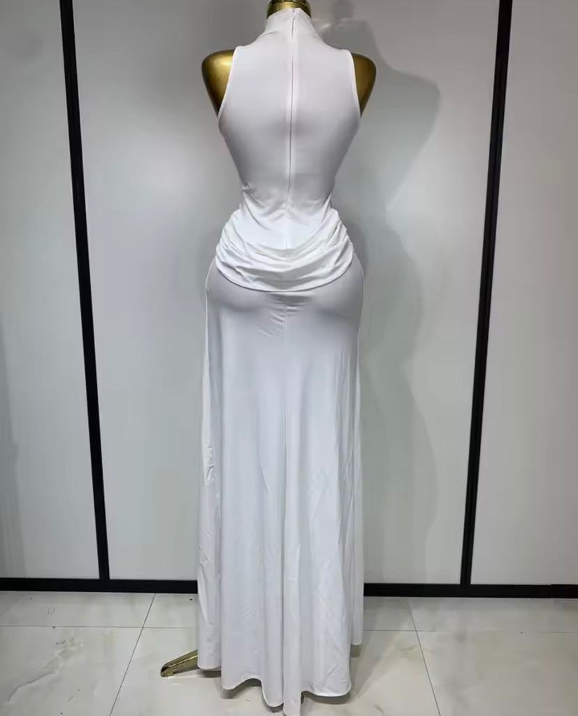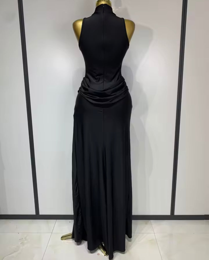 Women Sexy Sleeveless Solid Color Ruched Side Split Maxi Dress