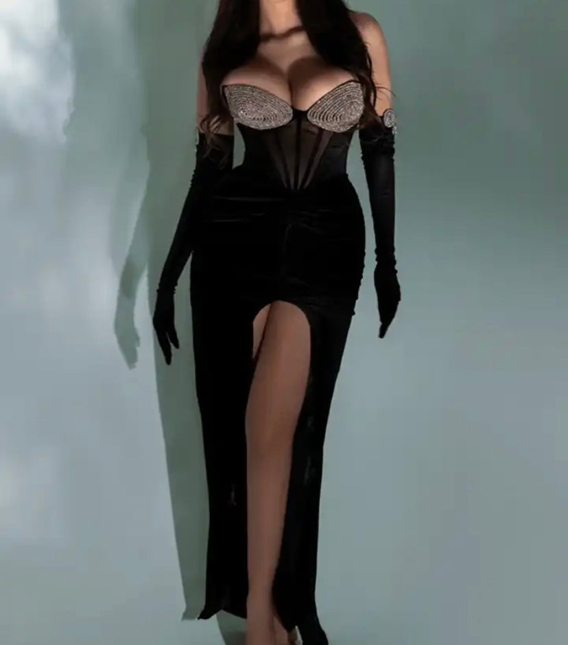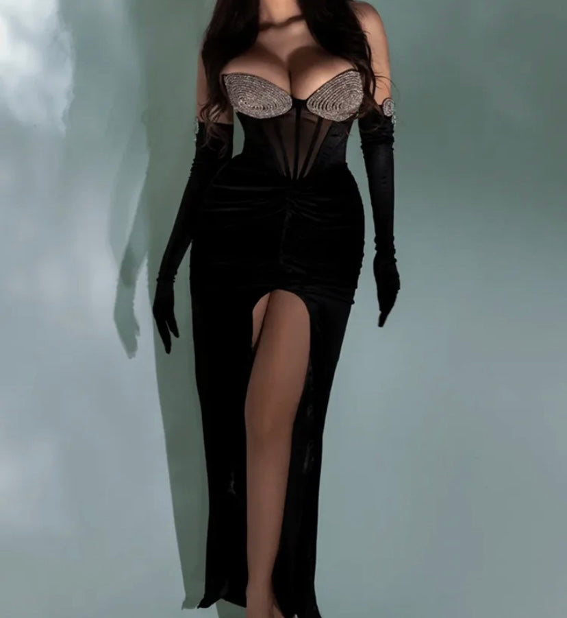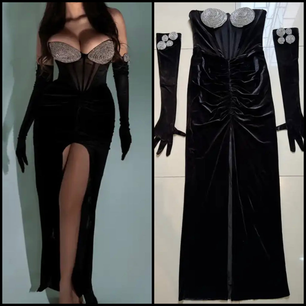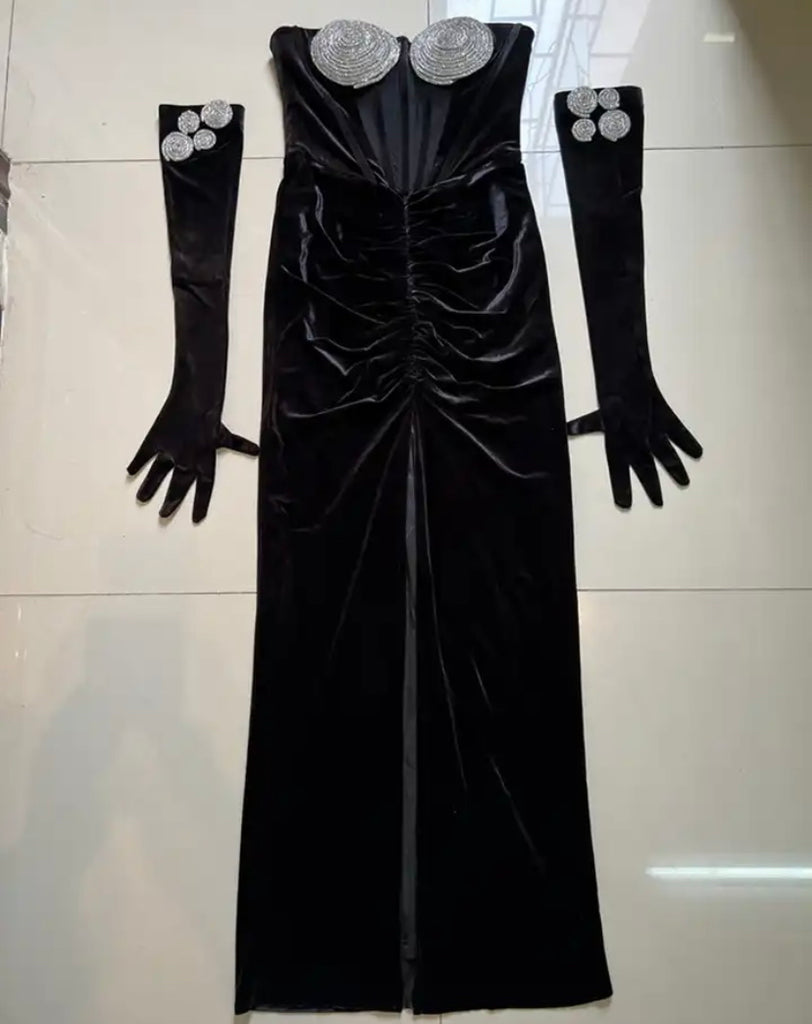 Women Black Sexy Strapless Velour Rhinestone Glove Maxi Dress