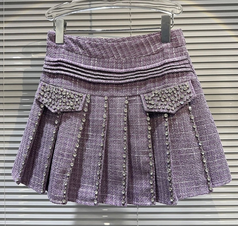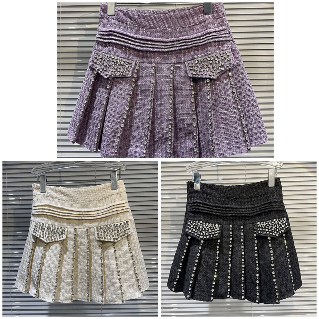 Women Fashion Rhinestone Tweed Pleated Skirt