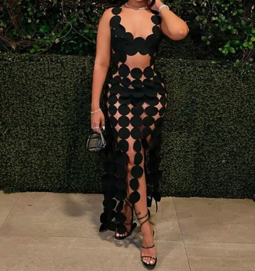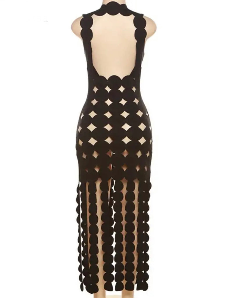 Women Black Sexy Sleeveless Hollow Out Tassel Dress