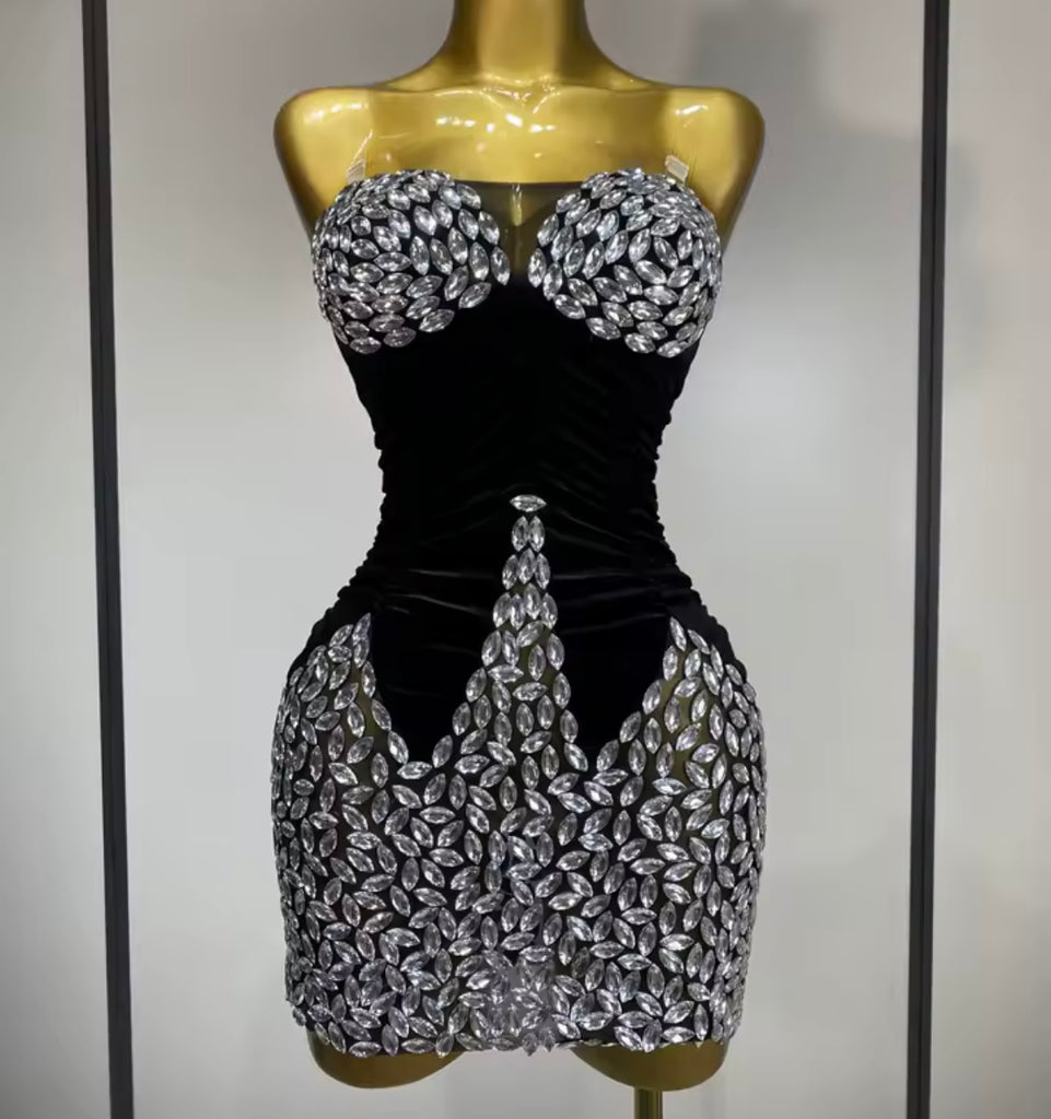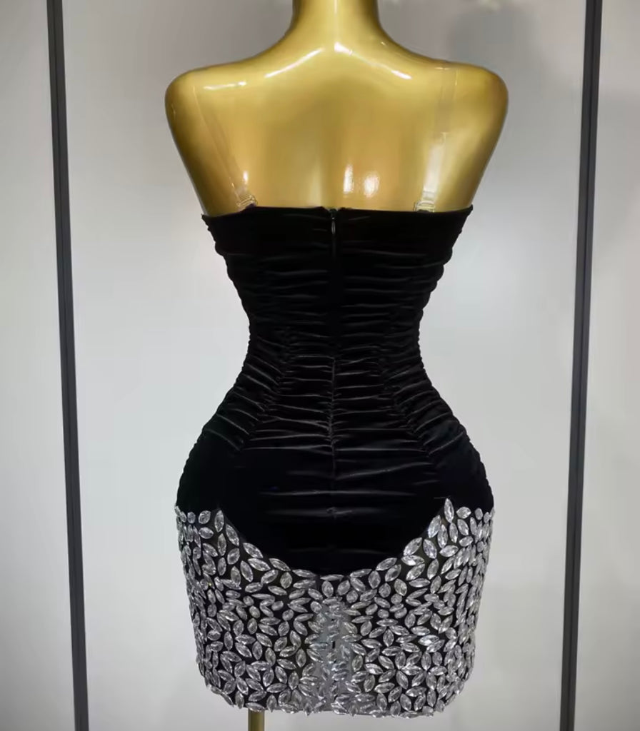 Women Sexy Sleeveless Crystal Black Ruched Velvet Dress