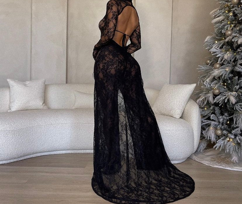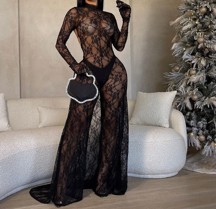 Women Sexy Black Lace Glove Full Sleeve Open Back Asymmetrical Jumpsuit
