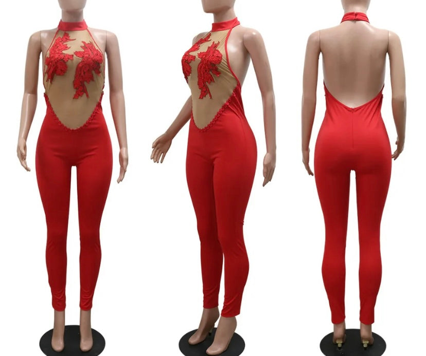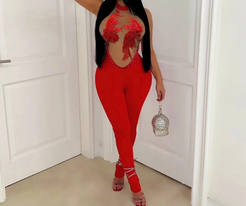 Women Sexy Sleeveless Sequins Mesh Patchwork Jumpsuit