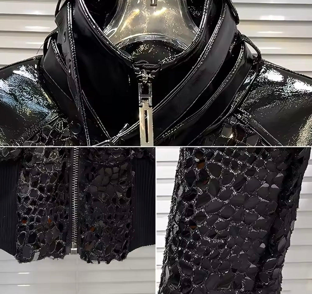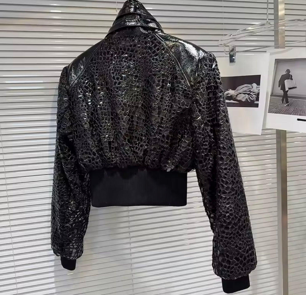 Women Black Fashion Crocodile Shiny Zip Up Jacket