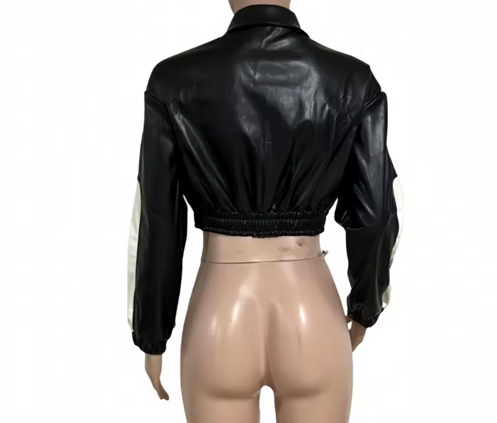 Women Color Zip Up Faux Leather Crop Jacket