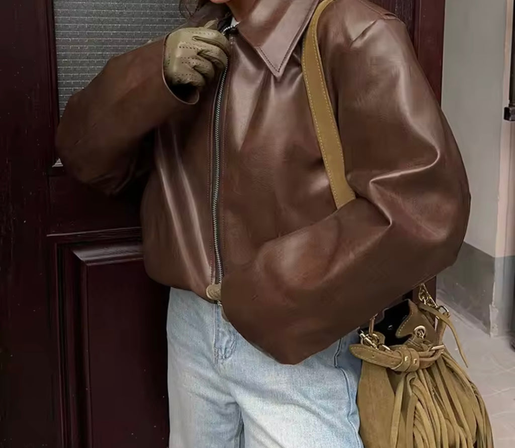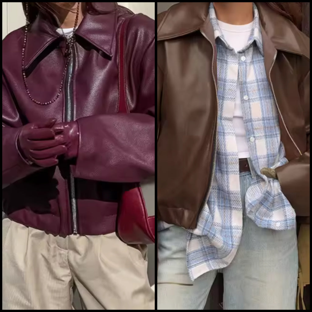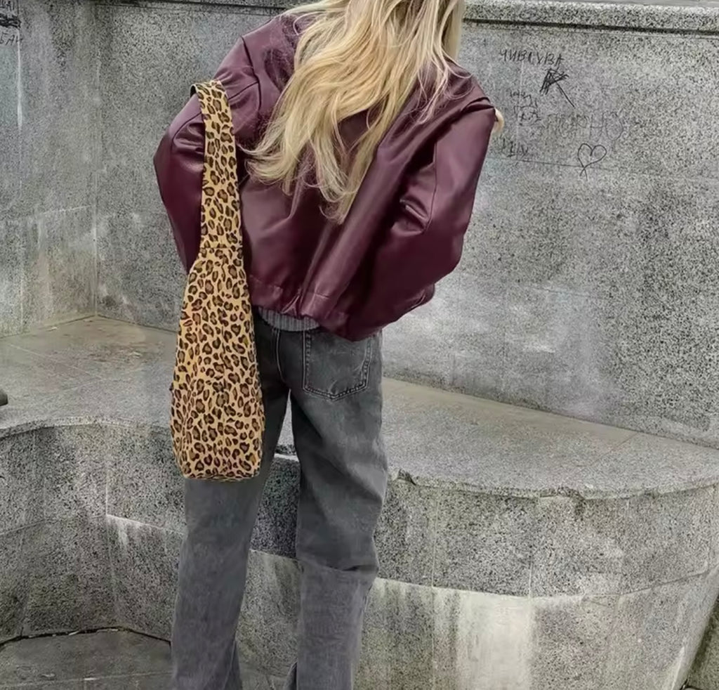 Women Color Printed Fashion Faux Leather Zip Up Jacket