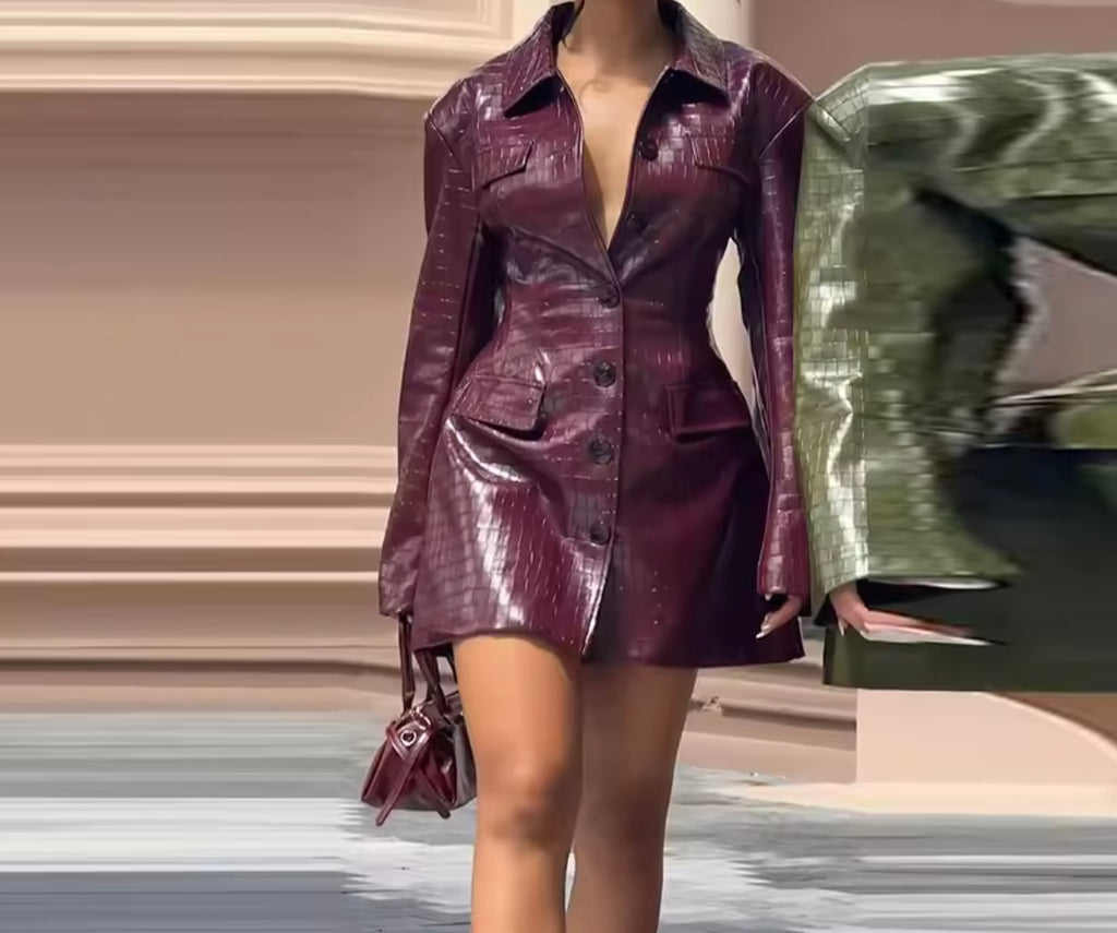 Women Fashion Button Belted Faux Leather Jacket