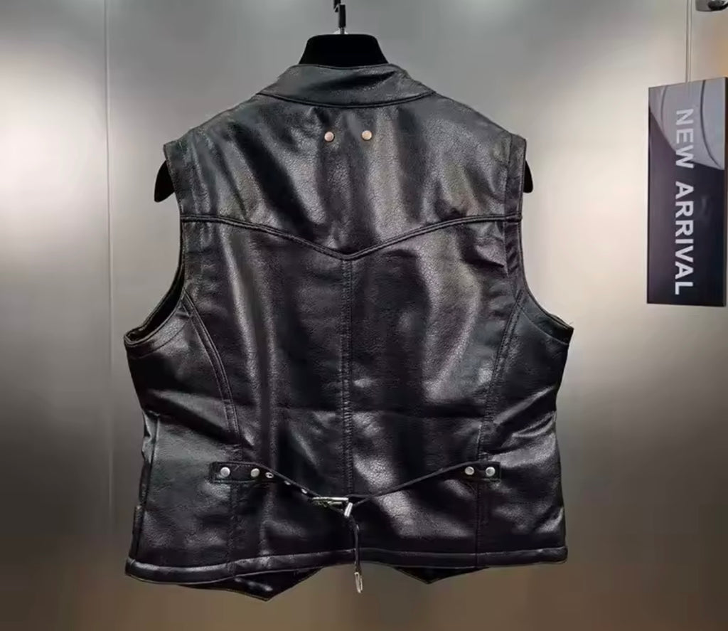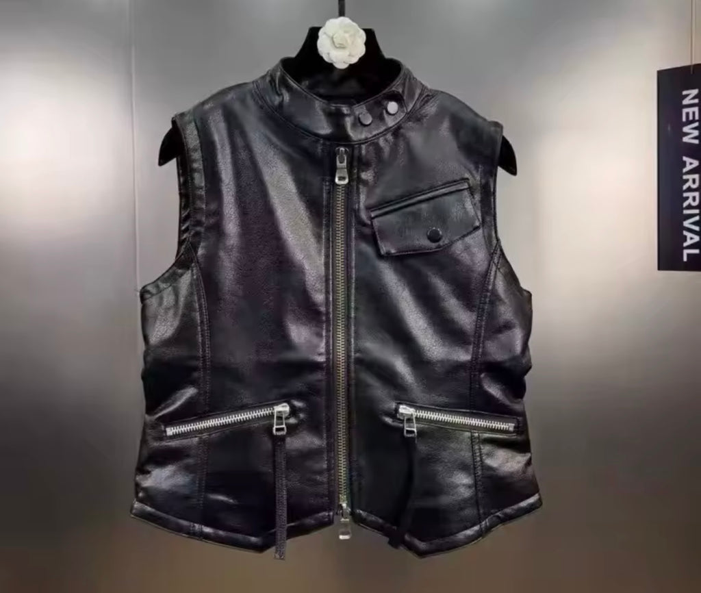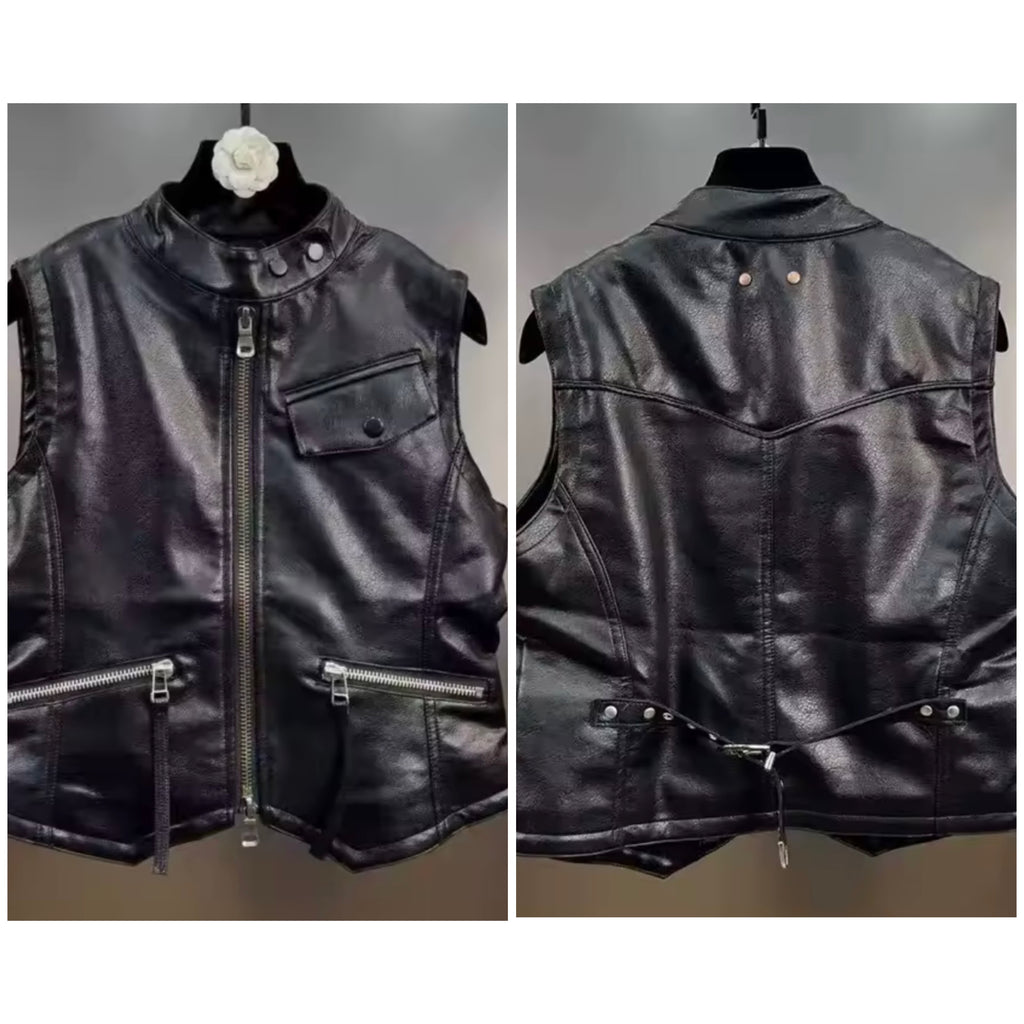 Women Sleeveless Fashion Faux Leather Black Vest Jacket