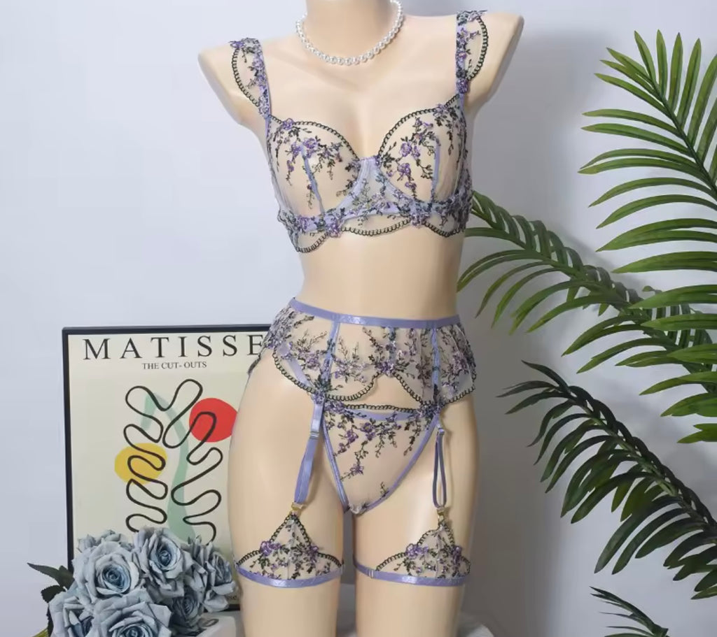 Women Sexy B&W Floral Lace Mesh Lingerie Set