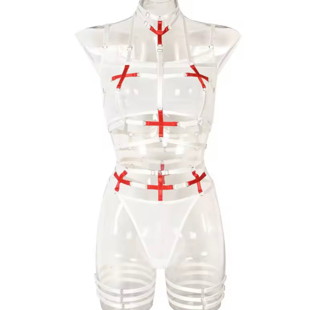 Women Red Bow Halter Sexy Heart Mesh Lingerie Set