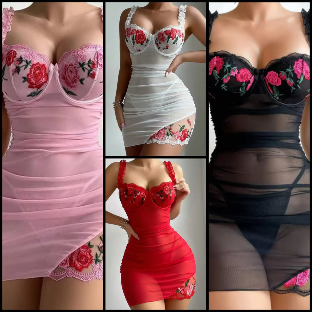 Women Red Bow Halter Sexy Heart Mesh Lingerie Set