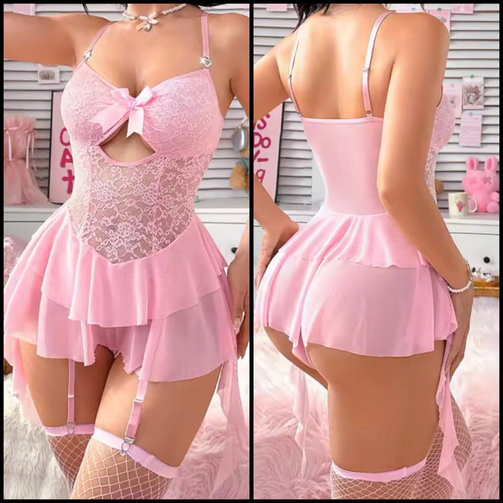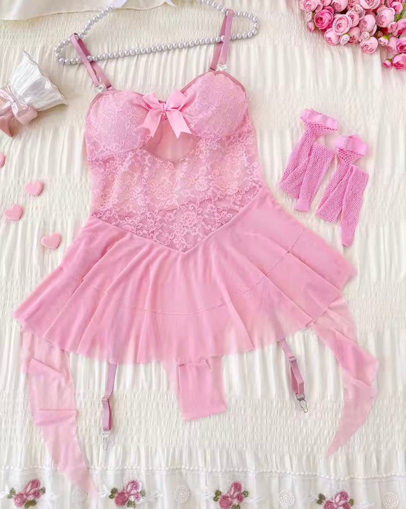 Women Sexy Ruffled Lace Mesh Bow Fishnet Lingerie Set
