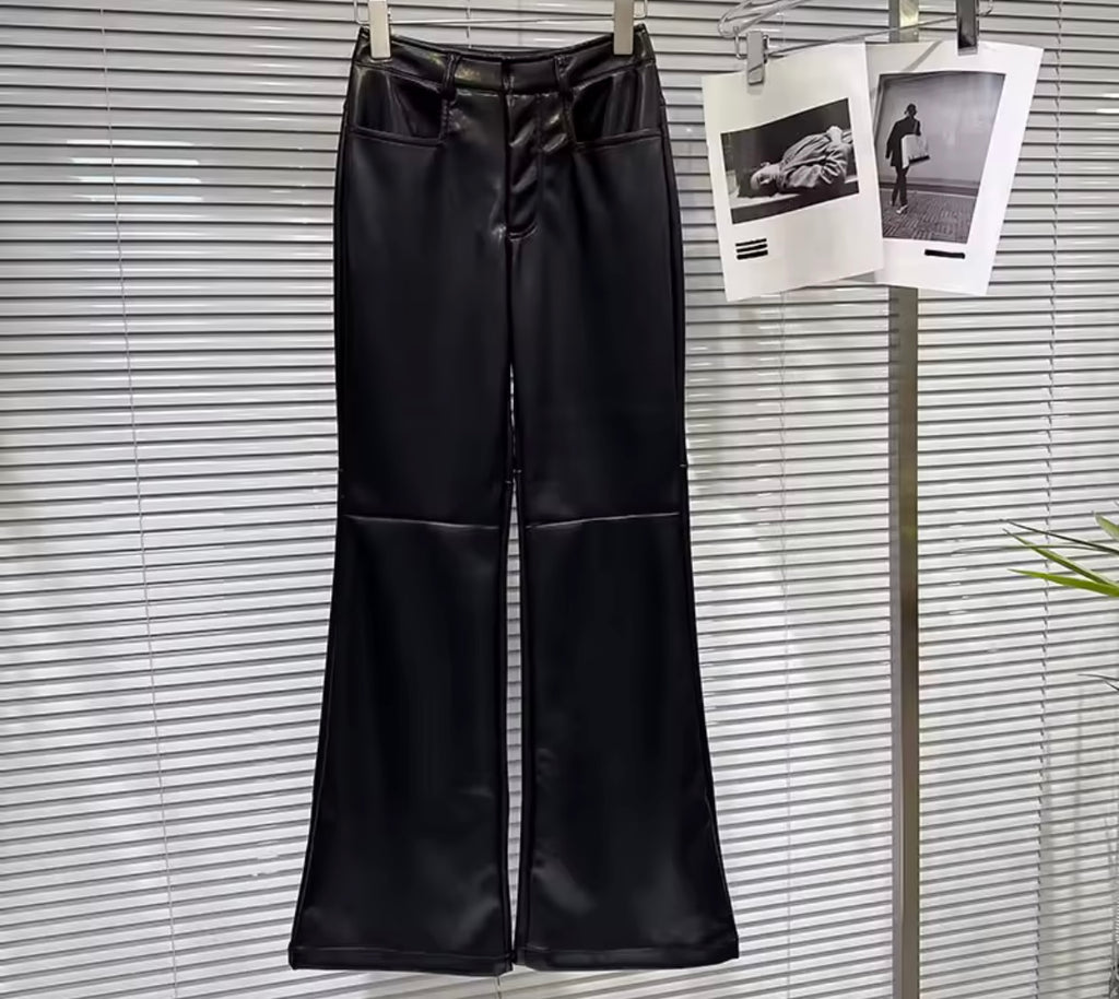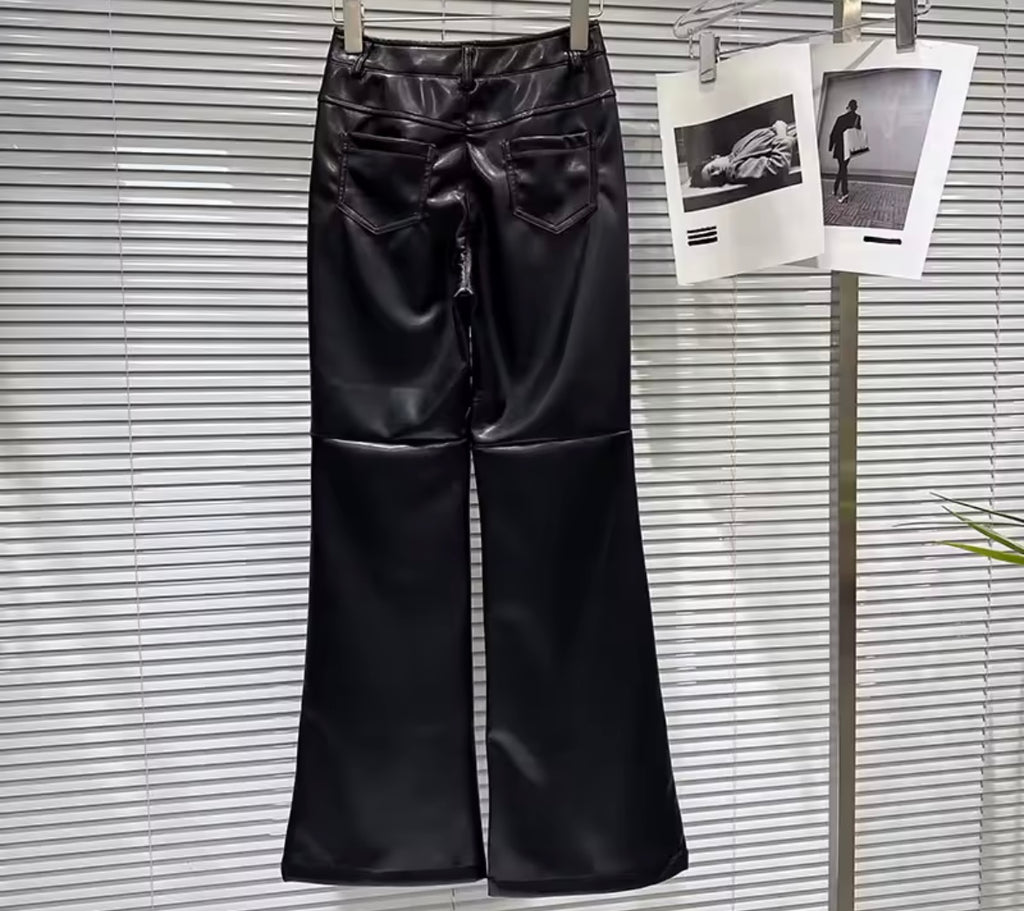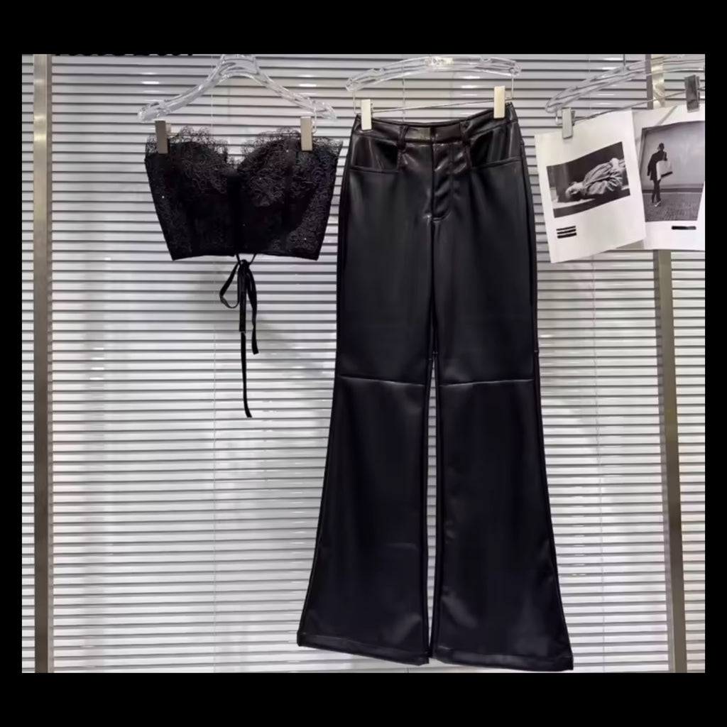 Women Fashion Faux Leather Two Piece Black Jacket Pant Set