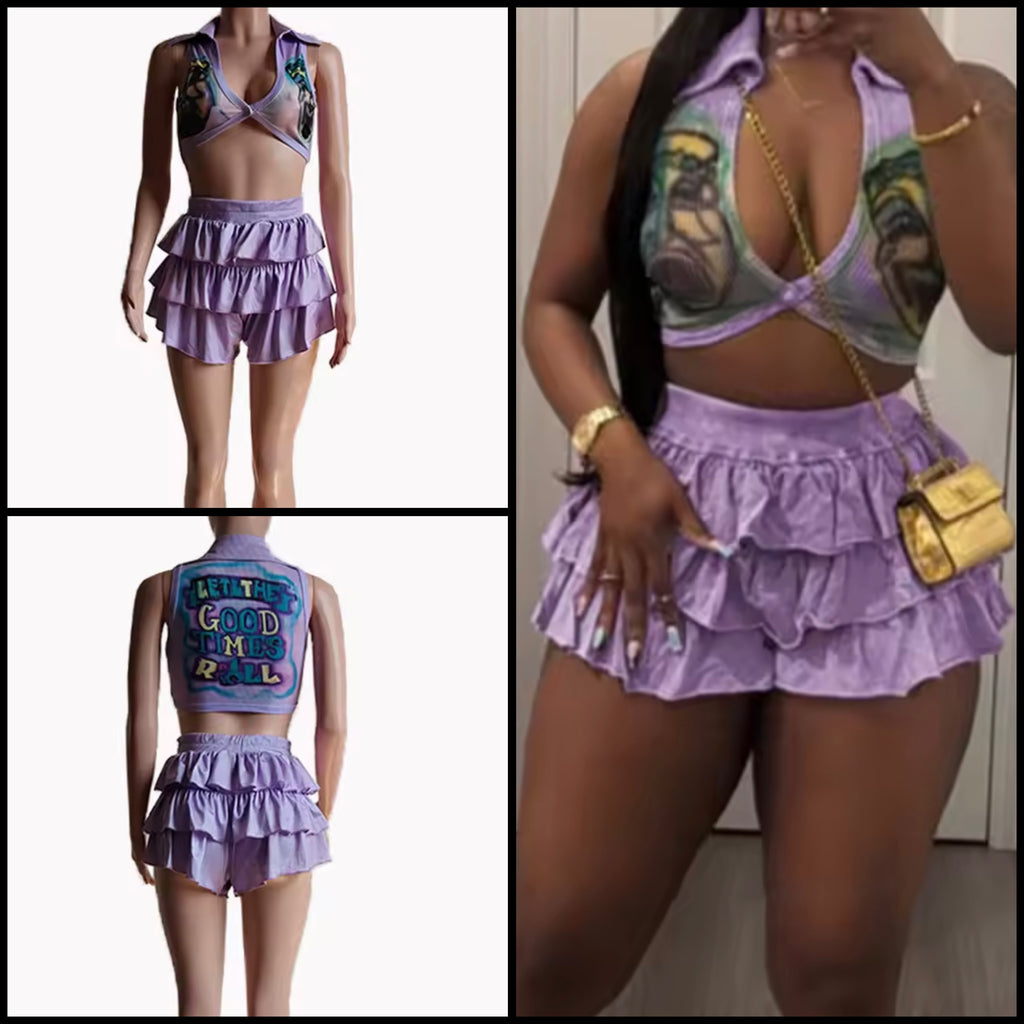 Women Fashion Fire Print Sleeveless Two Piece Short Set