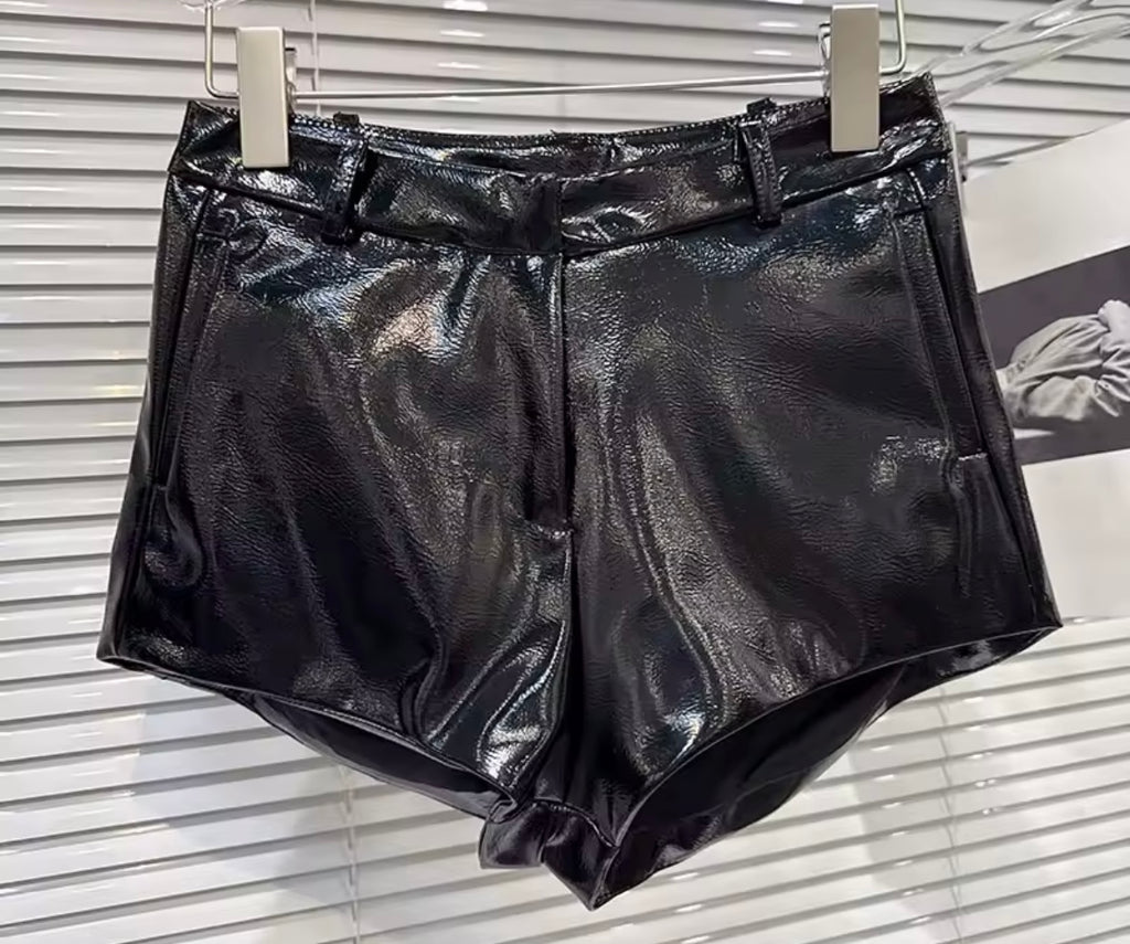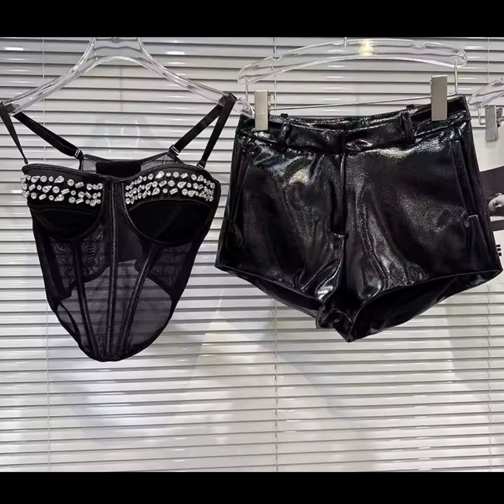 Women Sexy Sleeveless Crystal PU Two Piece Short Set