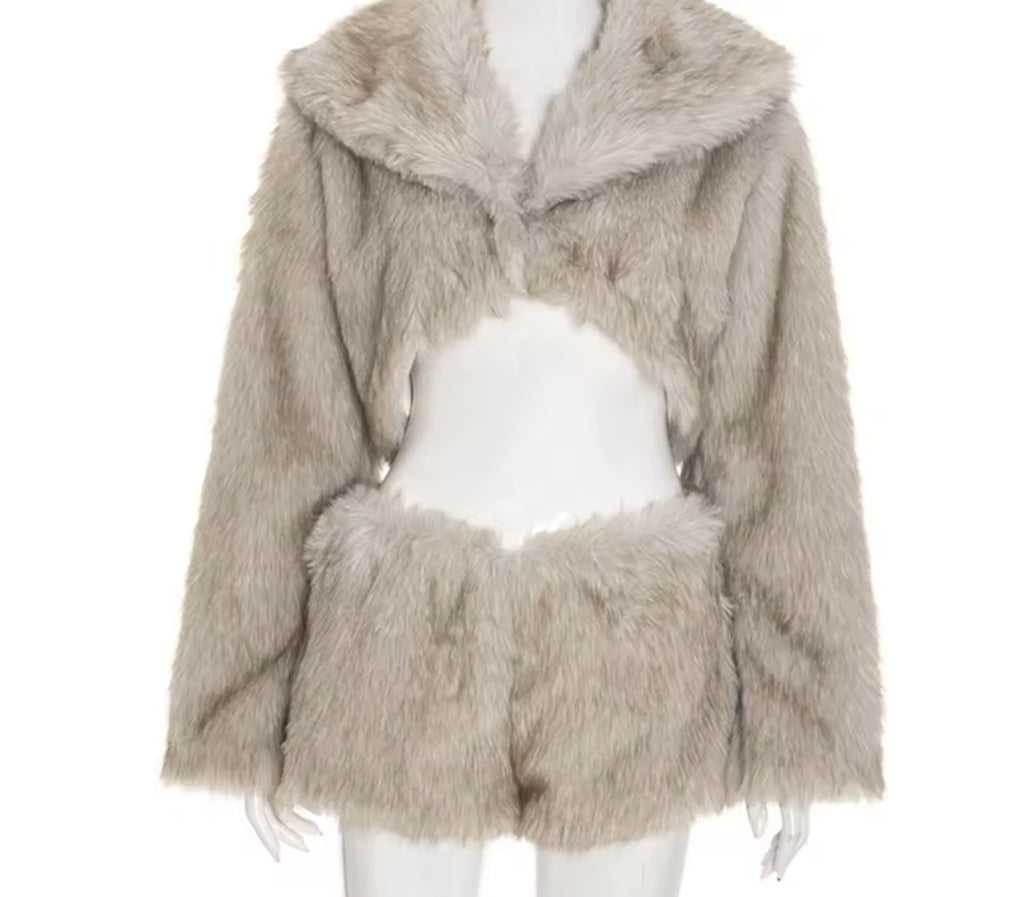 Women Sexy Fashion Faux Fur Crop Two Piece Short Set