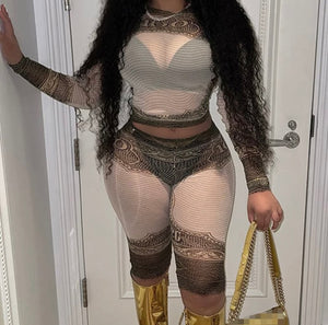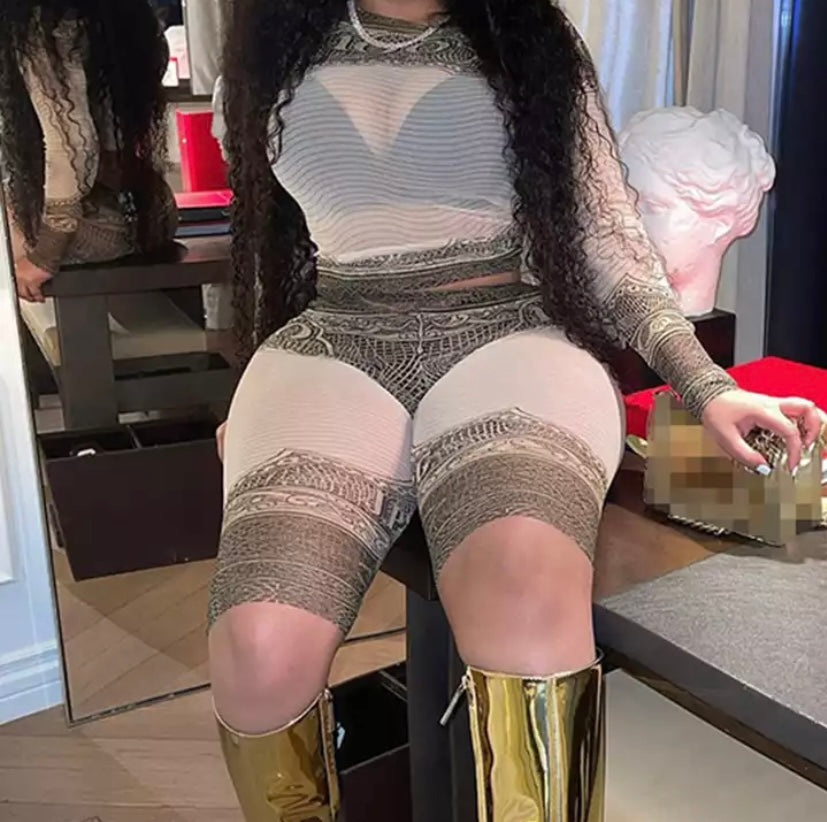 Women Sexy Money Mesh Full Sleeve Two Piece Short Set