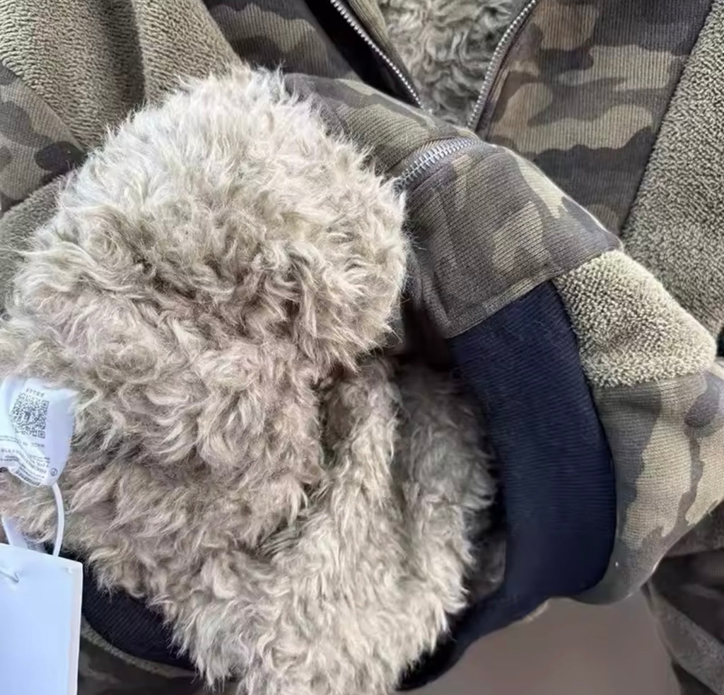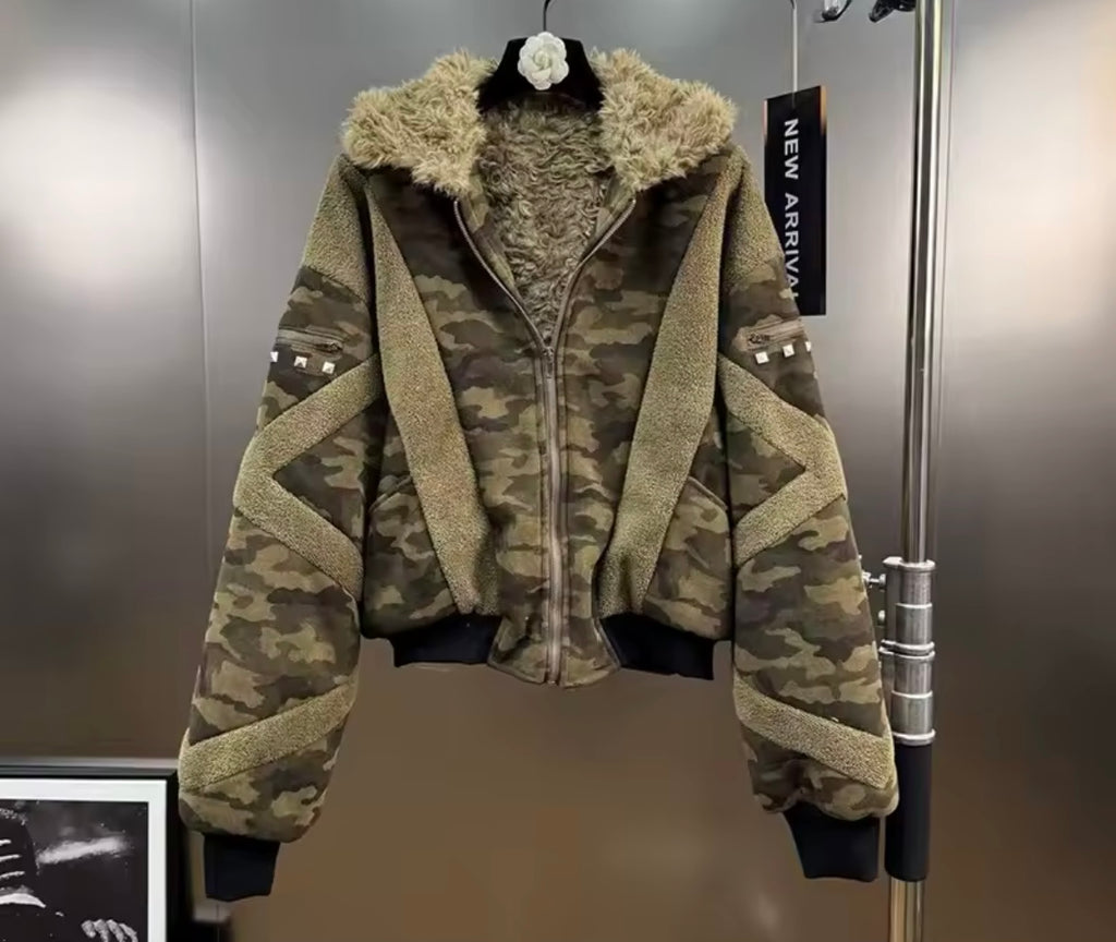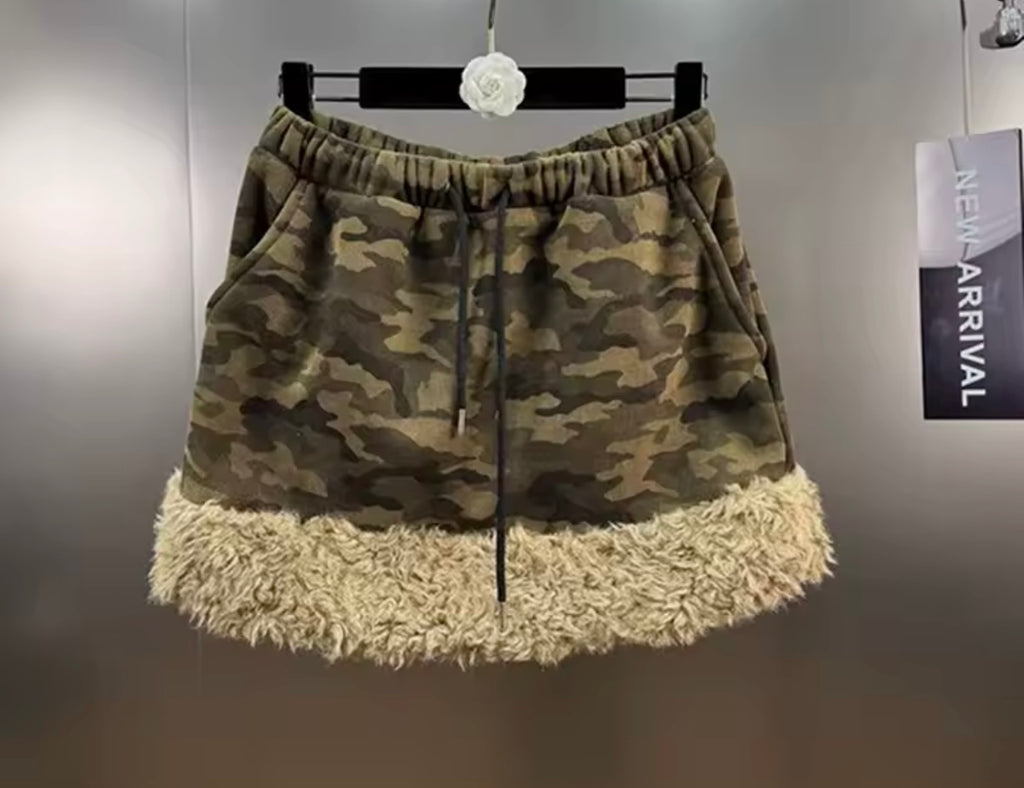 Women Camouflage Faux Fur Patchwork Two Piece Skirt Set