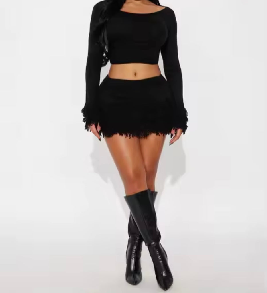 Women Color Fashion Full Sleeve Fringe Two Piece Skirt Set
