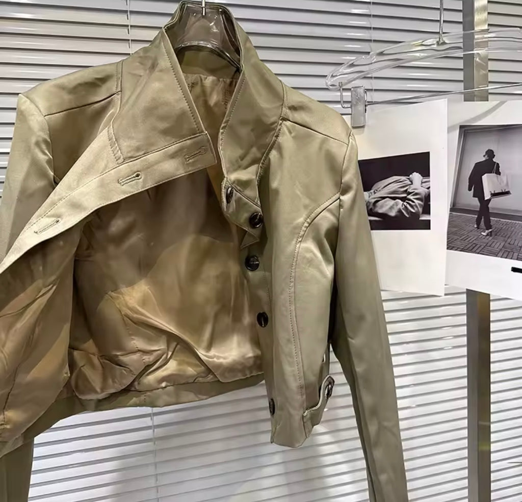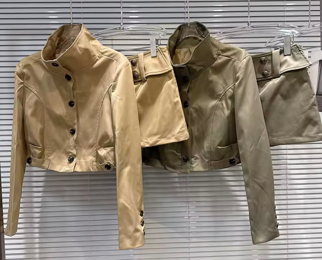 Women Khaki Fashion Trench Jacket Two Piece Ruffled Skirt Set