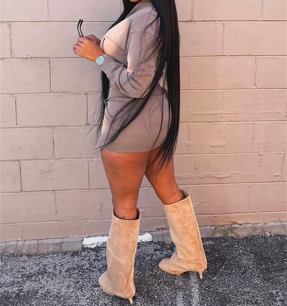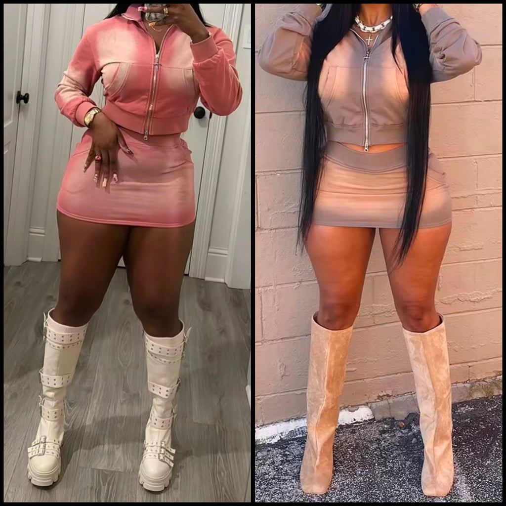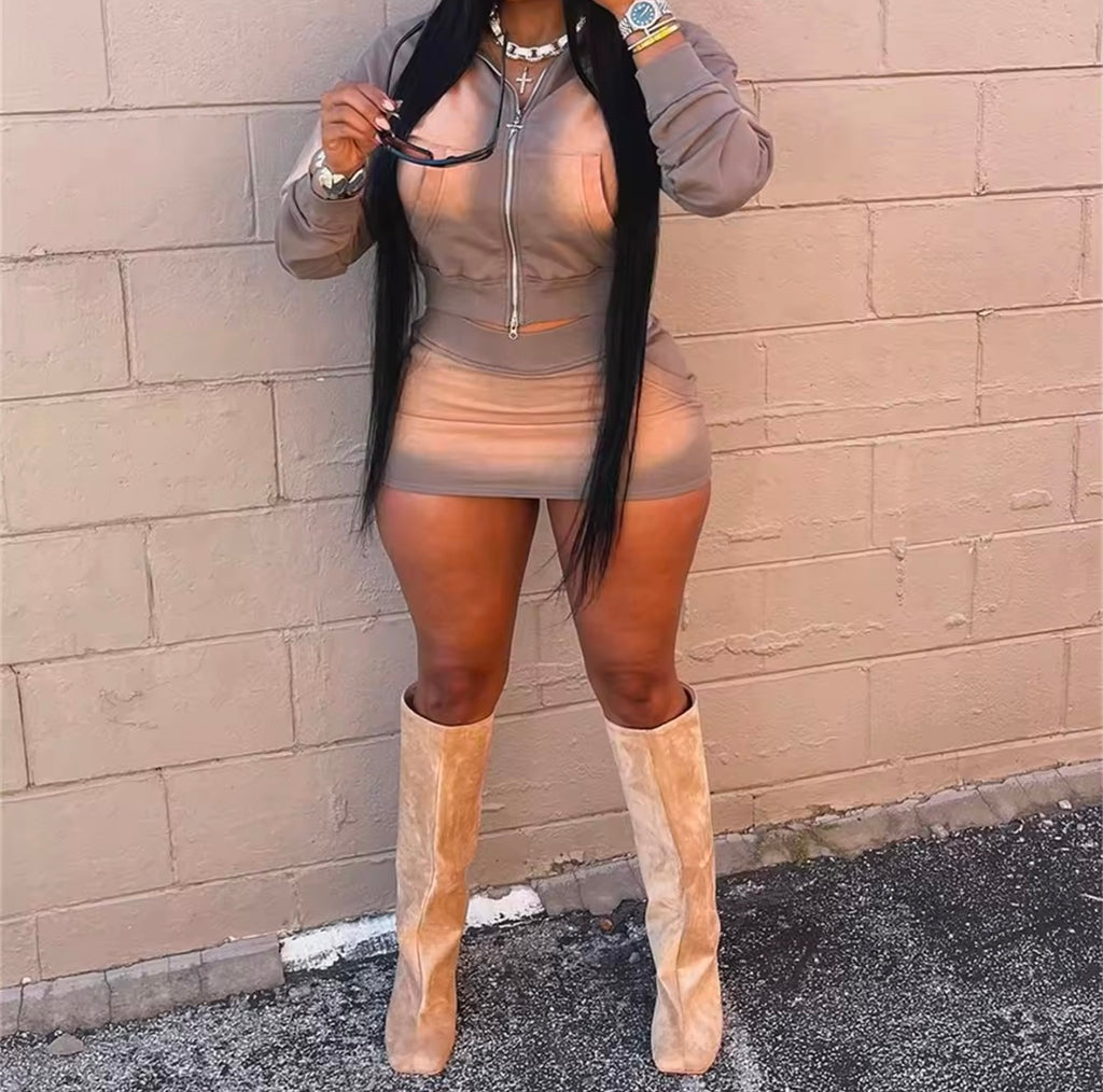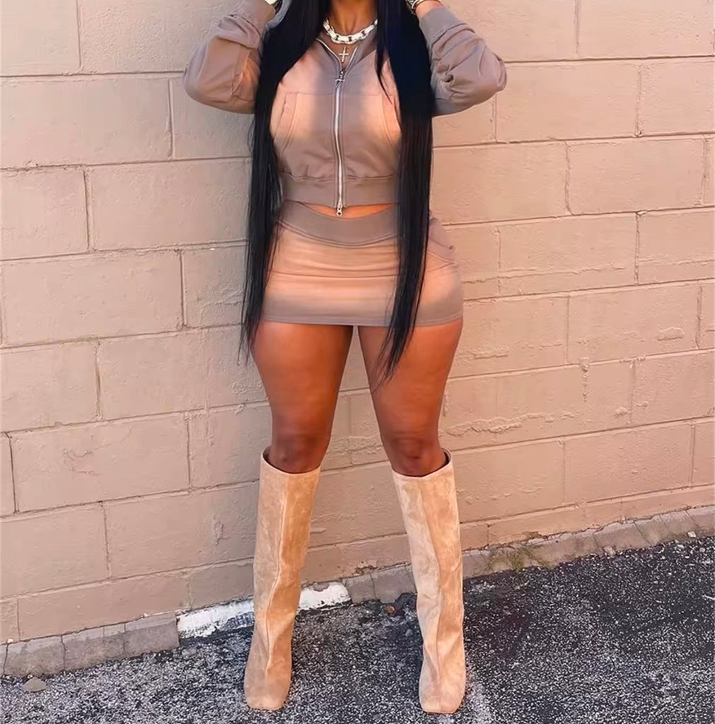 Women Khaki Fashion Trench Jacket Two Piece Ruffled Skirt Set