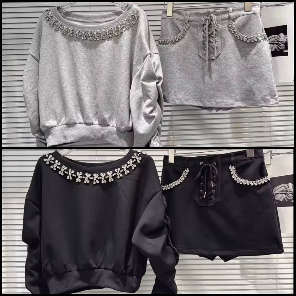 Women Black Faux Leather Button Up Fashion Two Piece Skirt Set