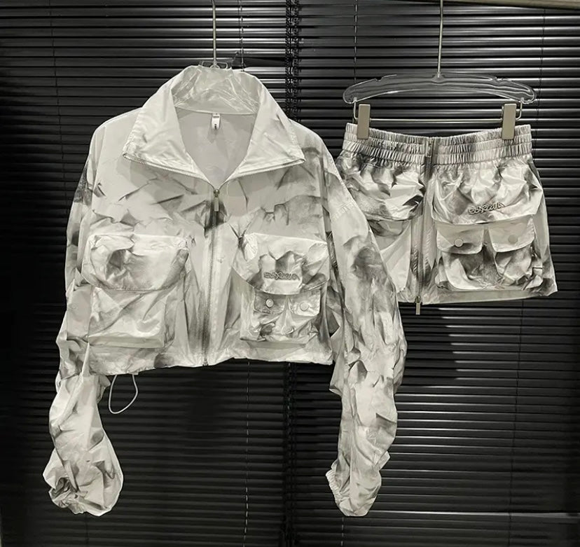Women Floral Double-Breasted Trench Two Piece Pleated Skirt Set