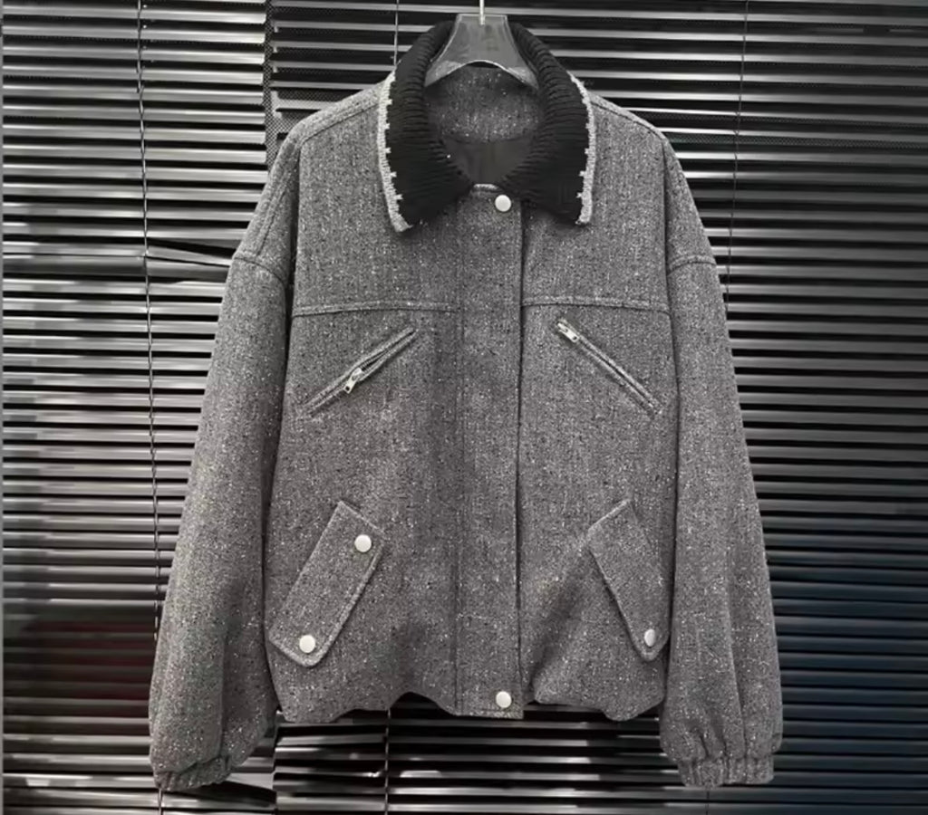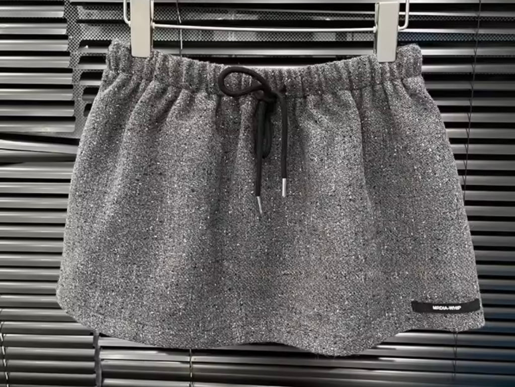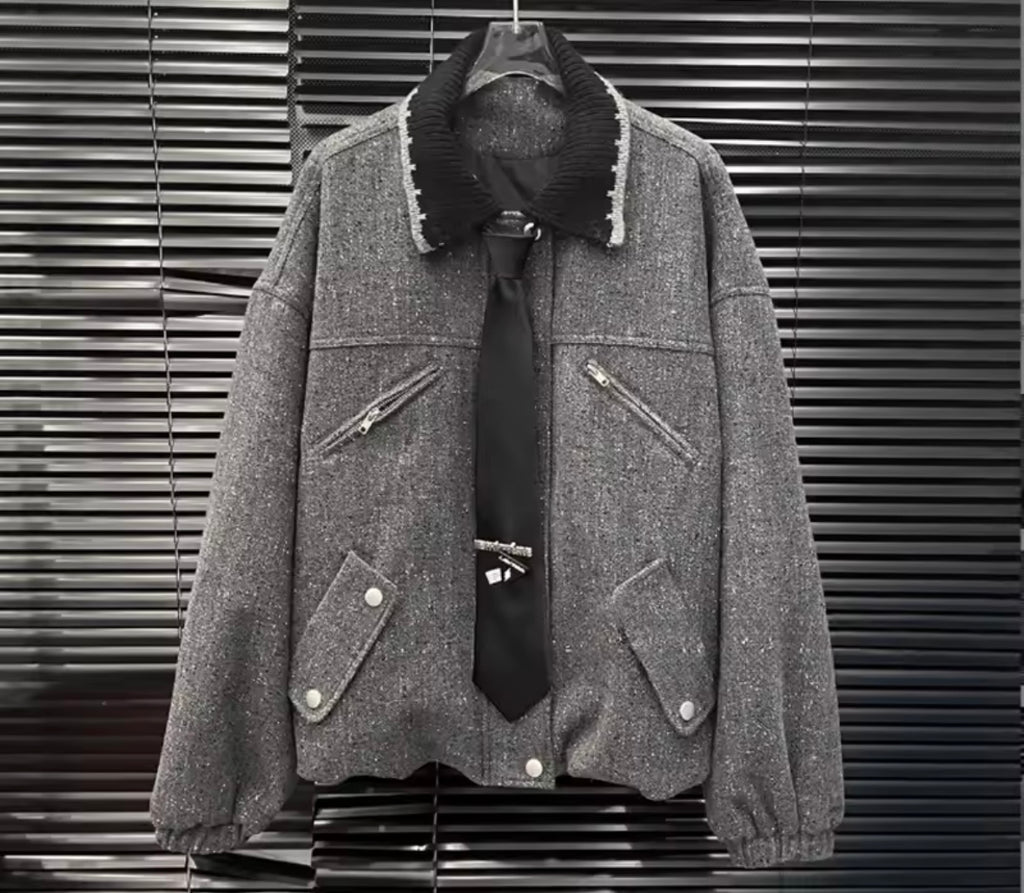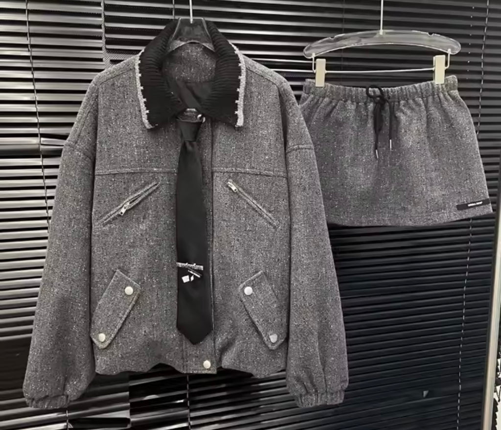 Women Gray Tie Fashion Jacket Two Piece Skirt Set