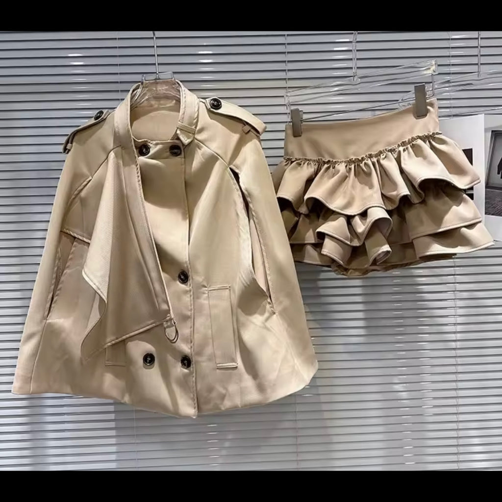 Women Floral Double-Breasted Trench Two Piece Pleated Skirt Set