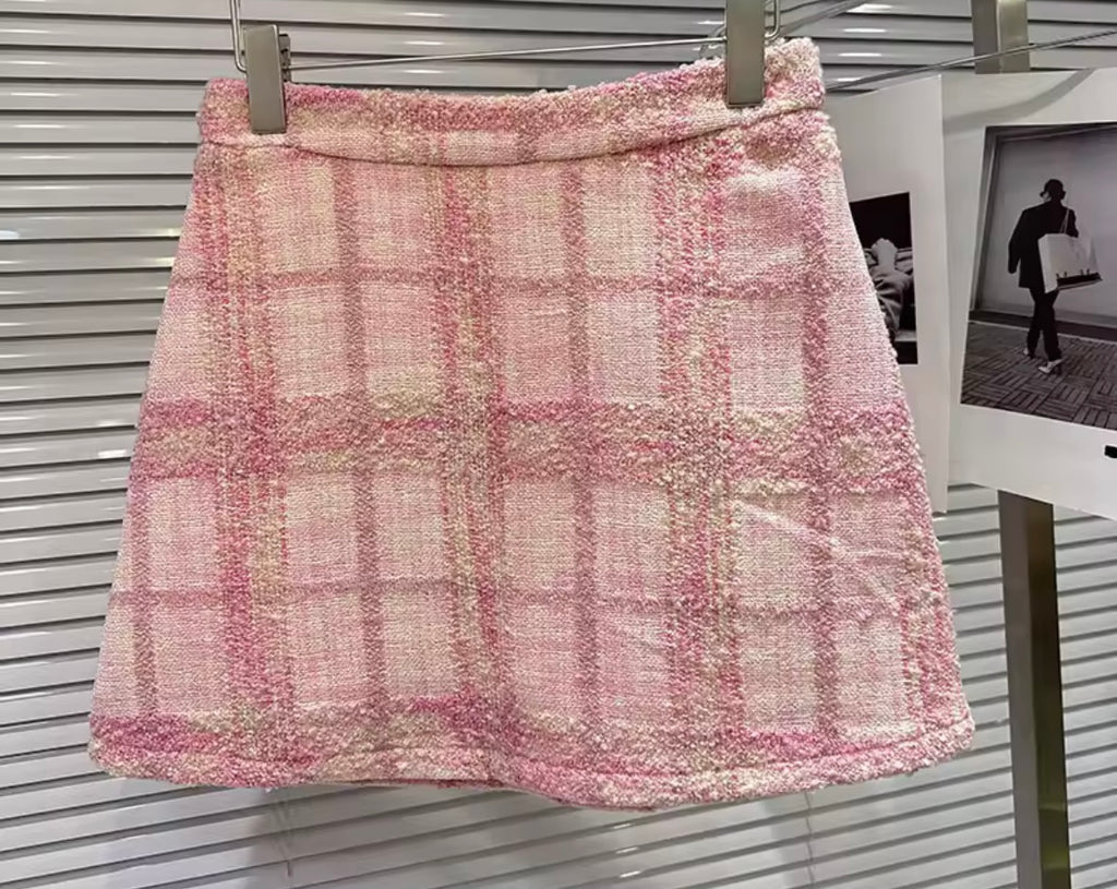 Women Beaded Plaid Patchwork Suede Jacket Two Piece Skirt Set