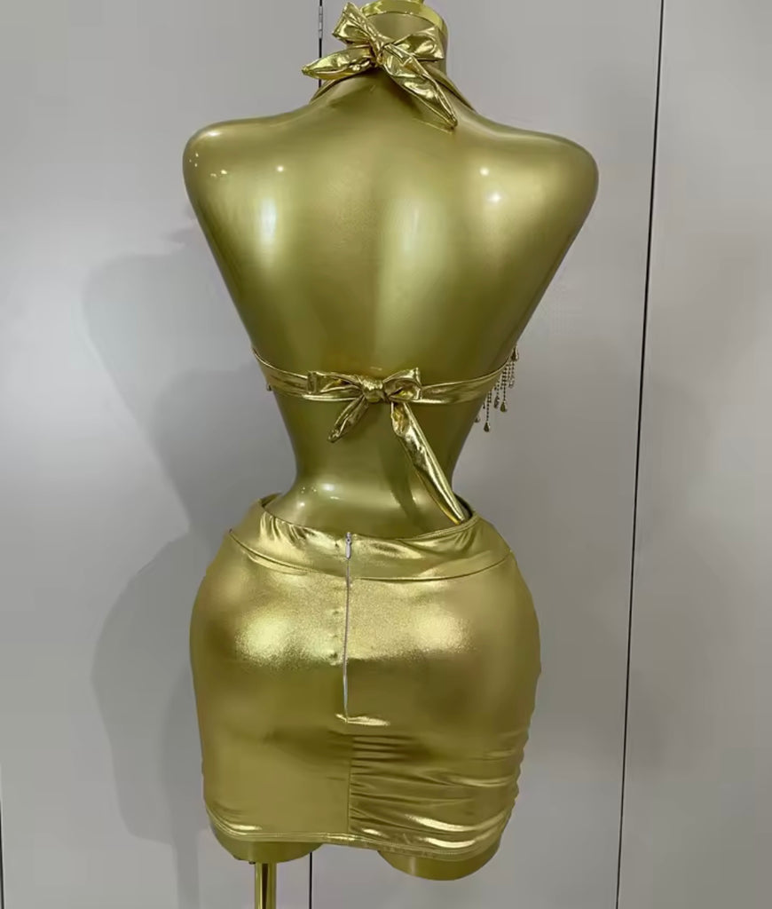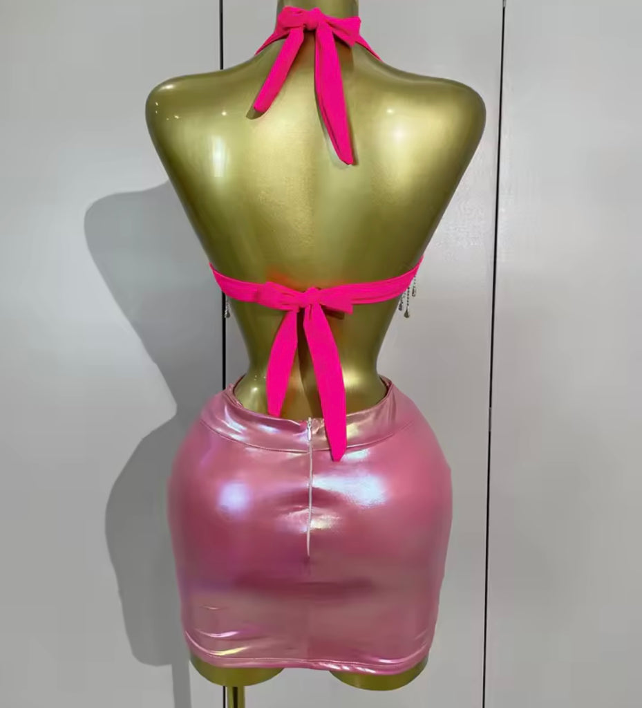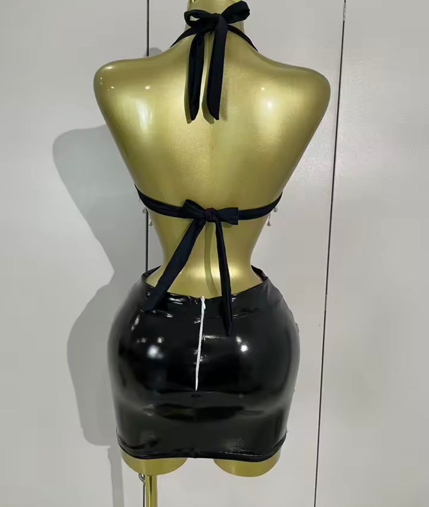 Women Black Faux Leather Button Up Fashion Two Piece Skirt Set