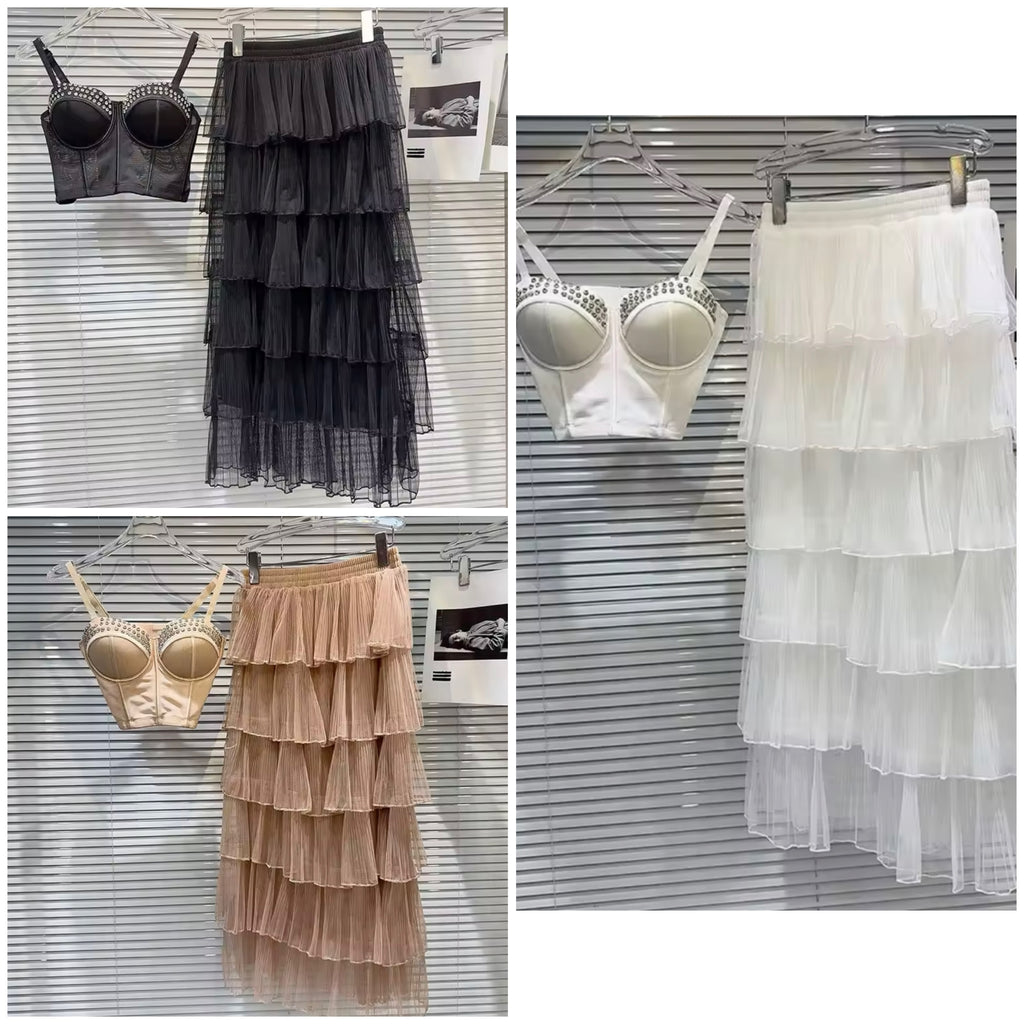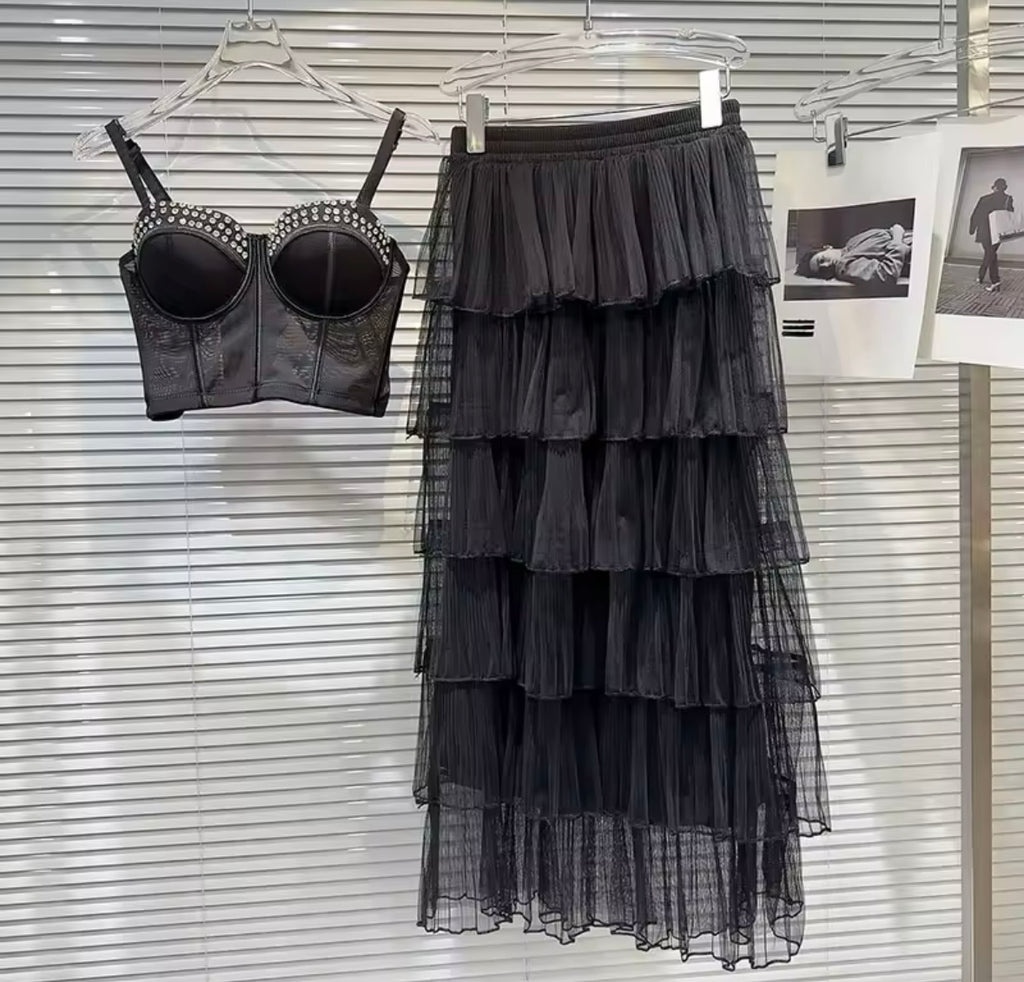 Women Ruffled Bow Tie Full Sleeve Two Piece Bling Skirt Set
