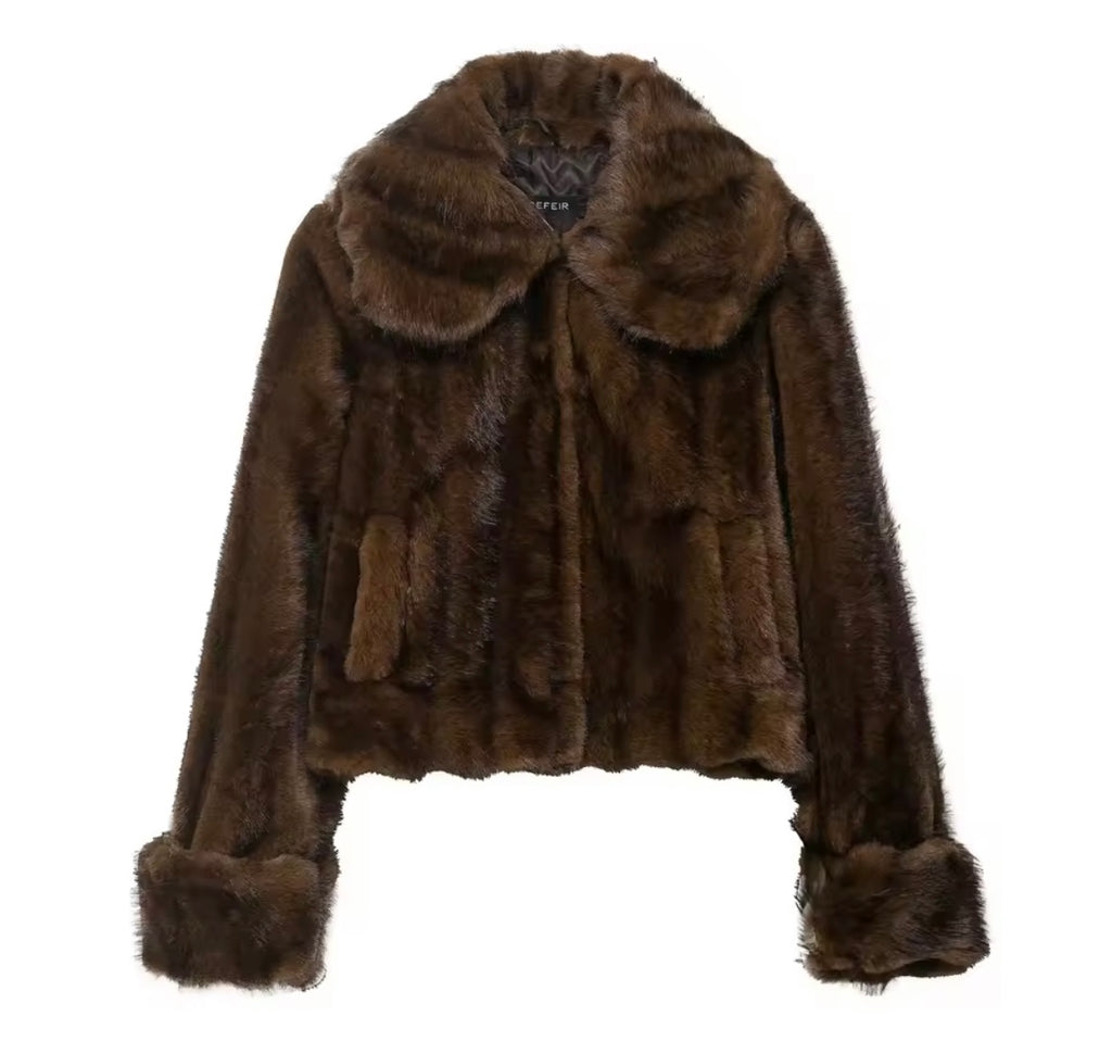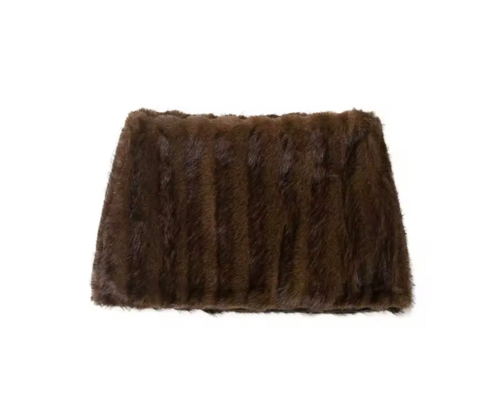 Women Sexy Fashion Brown Faux Fur Jacket Two Piece Skirt Set