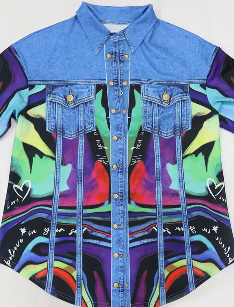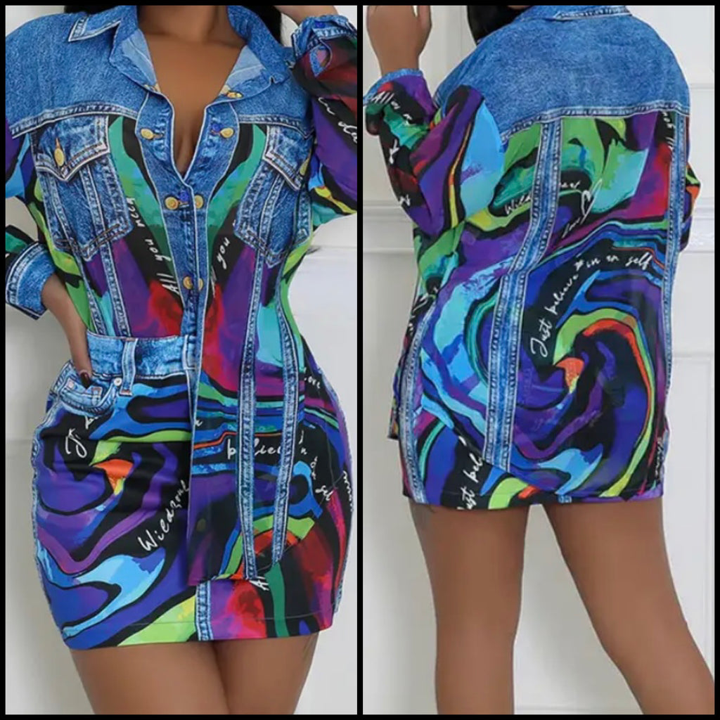 Women Sexy Full Sleeve Printed Denim Patchwork Two Piece Skirt Set