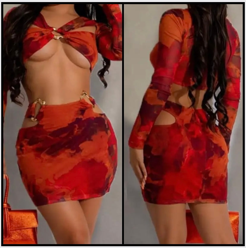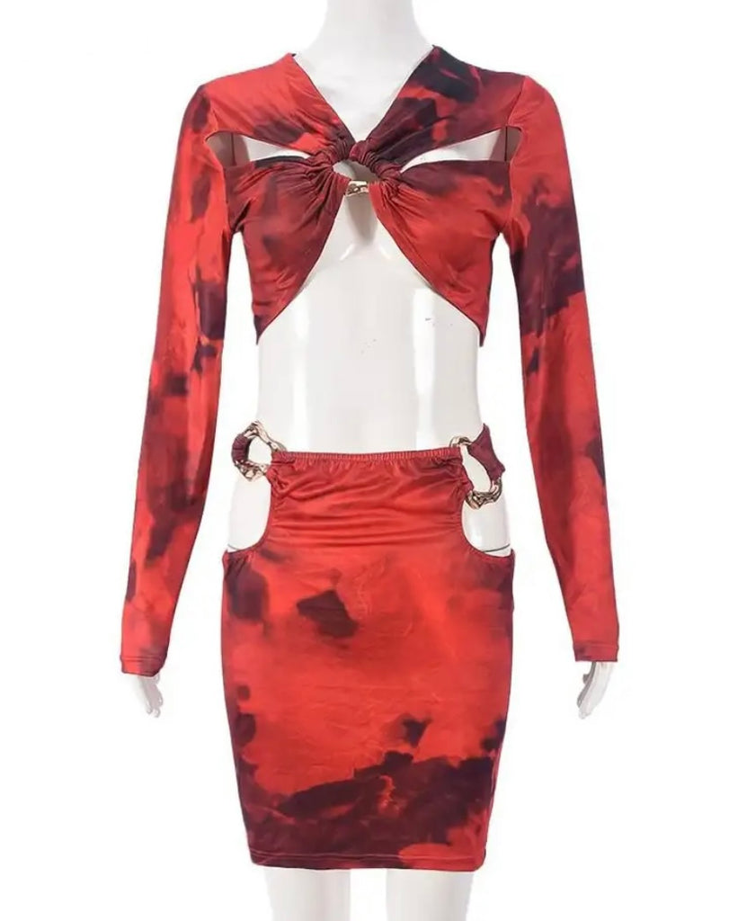 Women Sexy Red Printed Cut Out Full Sleeve Crop Two Piece Skirt Set