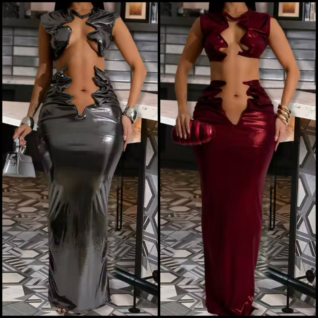 Women Gold Metal Black Faux Leather Jacket Two Piece Skirt Set