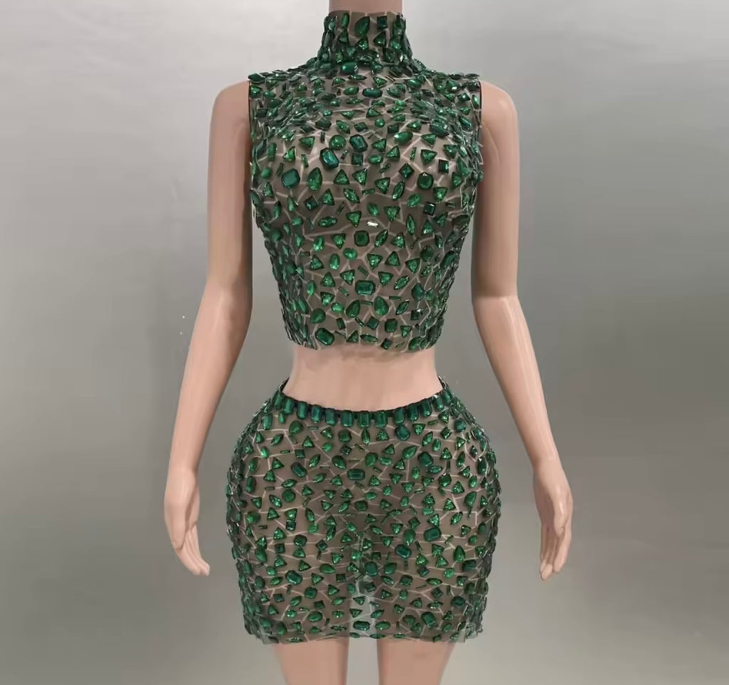Women Sexy Sleeveless Green Crystal Mesh Two Piece Skirt Set