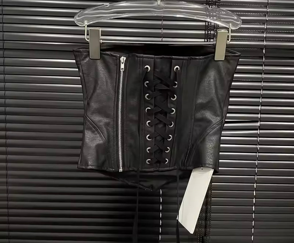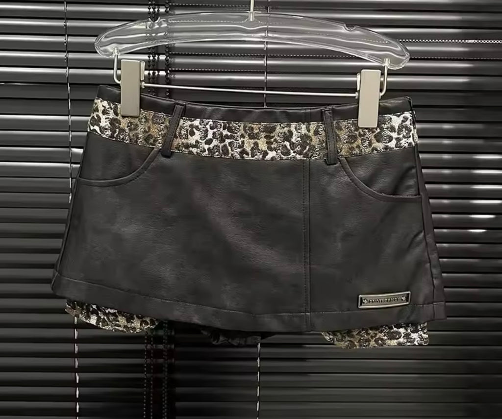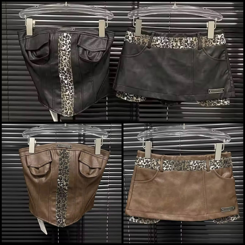 Women Gold Metal Black Faux Leather Jacket Two Piece Skirt Set