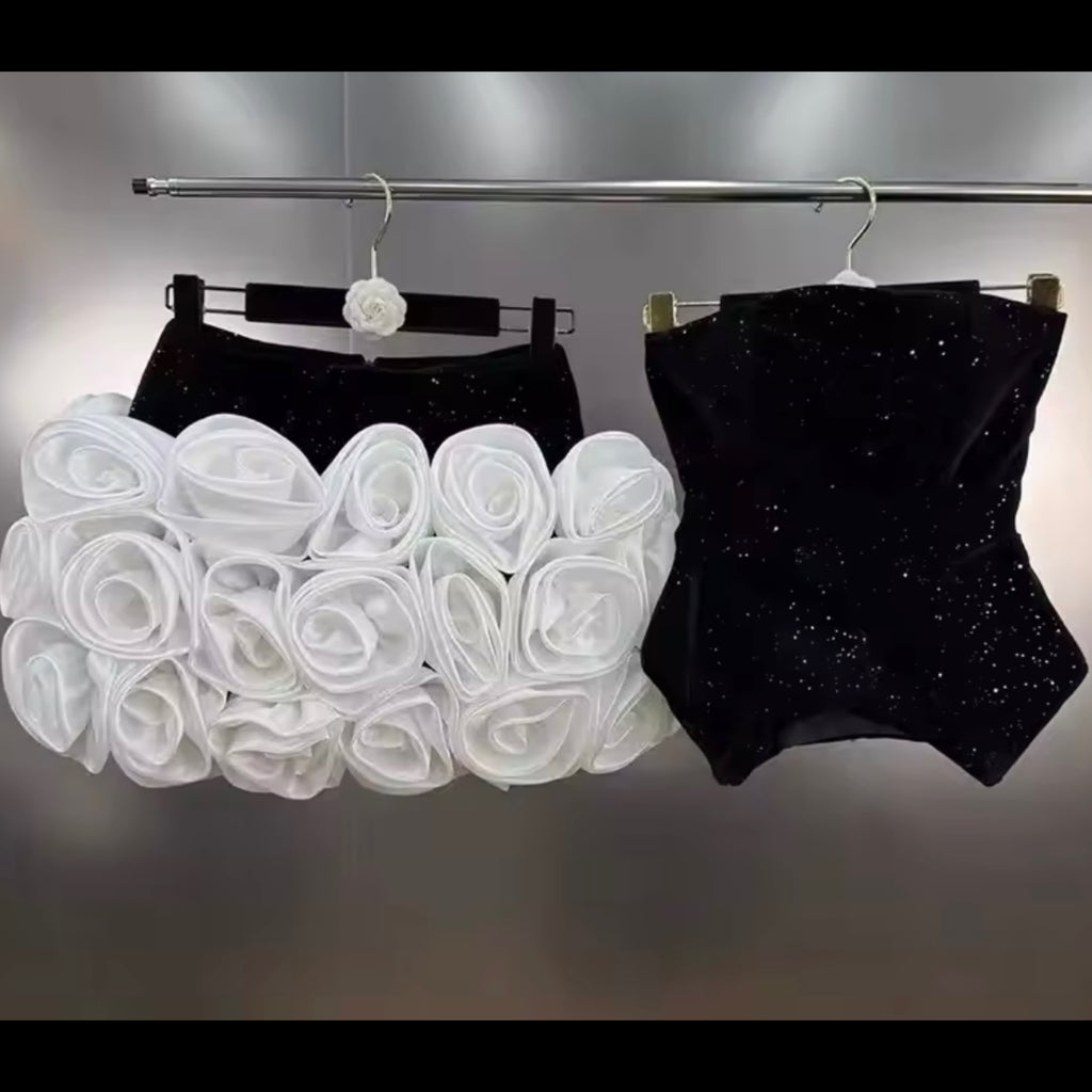 Women B&W Feather Button Up Blazer Two Piece Tweed Skirt Set