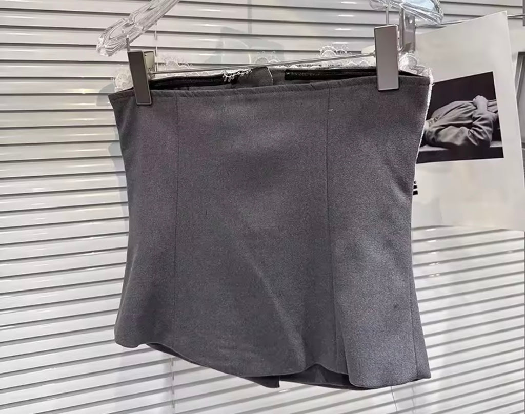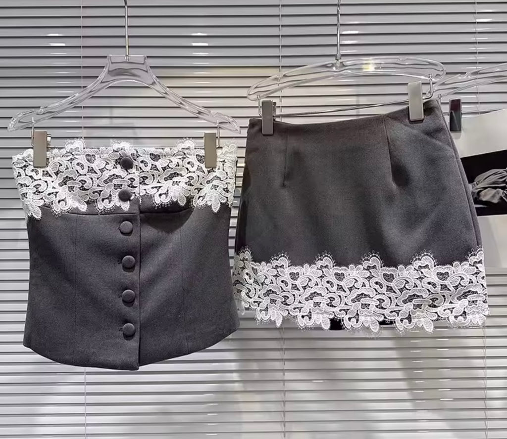 Women Sexy Black Lace Strapless Ribbon Two Piece Skirt Set