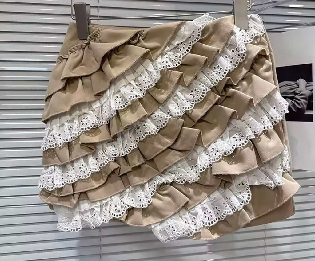 Women Khaki Fashion Trench Jacket Two Piece Ruffled Skirt Set