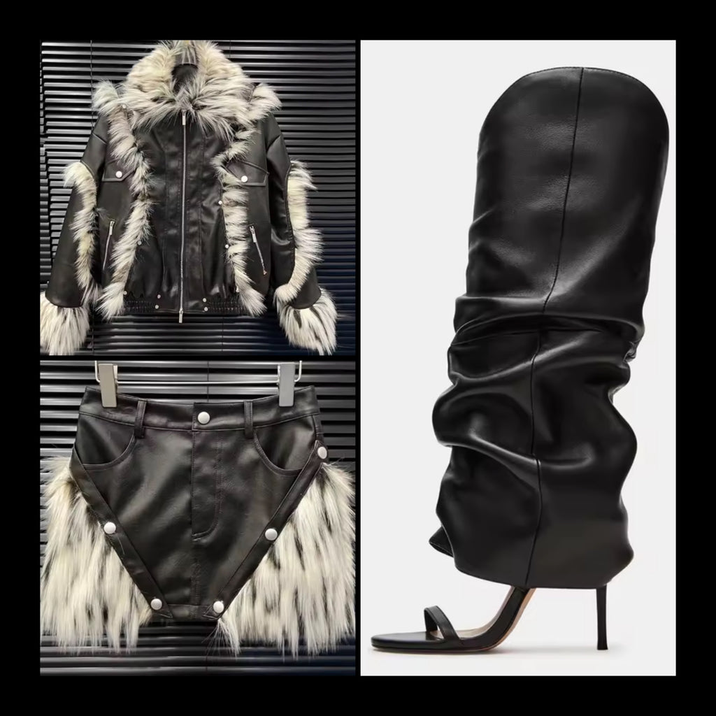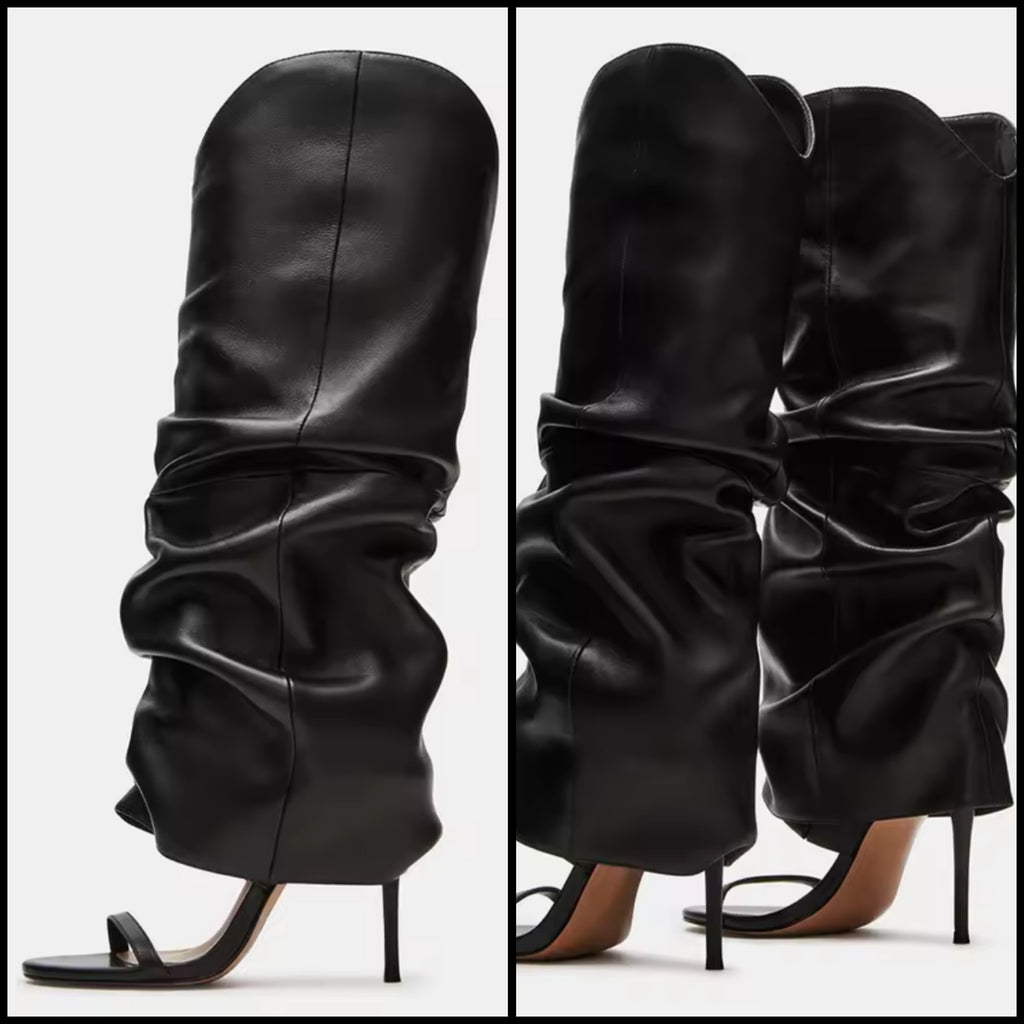 Women Black Open Toe Ruched Faux Leather Fashion Boots