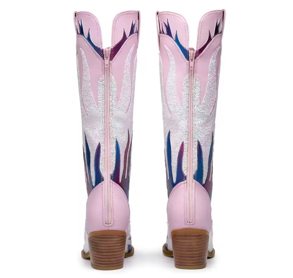 Women Fashion Pink Colorful Print Knee High Western Boots