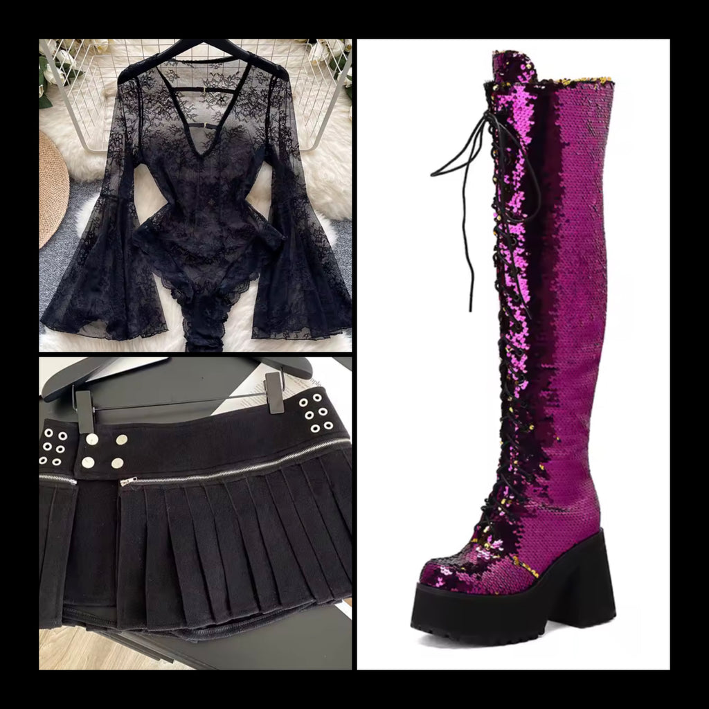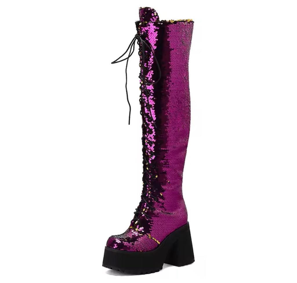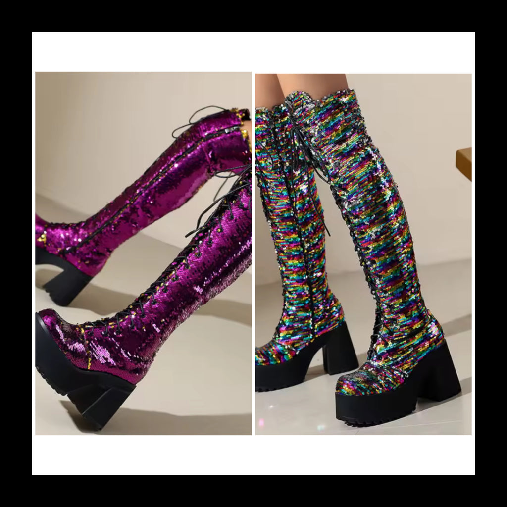 Women Fashion Rivet Fringe Buckle Denim Knee High Boots