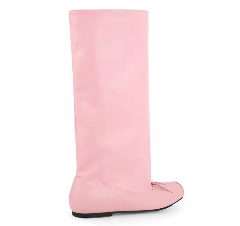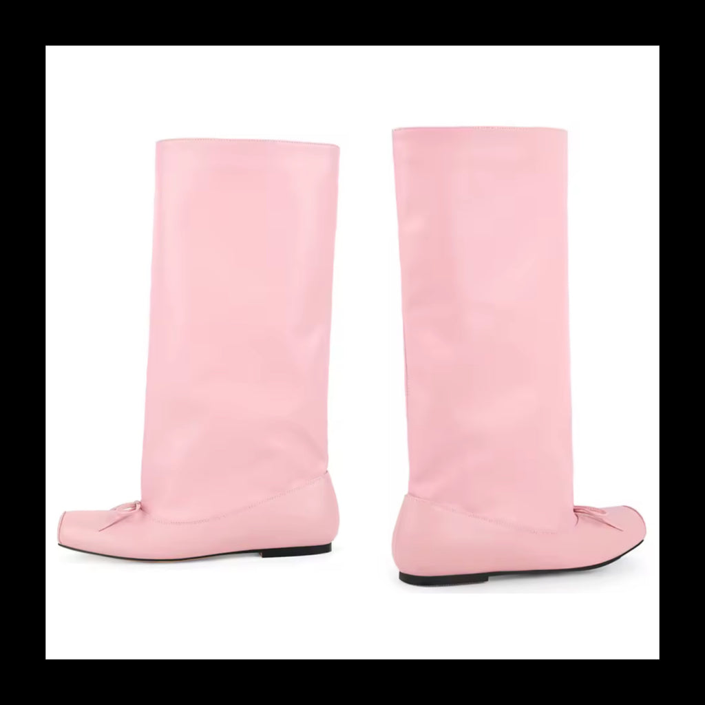 Women Pink Square Toe Bow Fashion Flat Knee High Boots